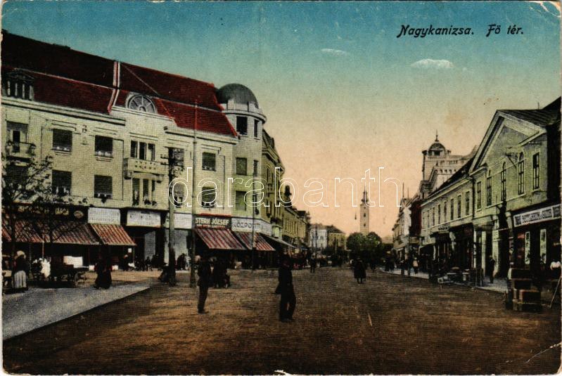 1925 Nagykanizsa, Fő tér, Stern József, Bettlheim és Guth üzlete. Vasúti Levelezőlapárusítás (kis szakadás / small tear...