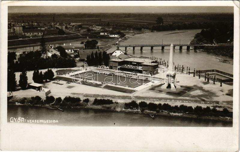 1931 Győr, Cziráky tér a versenyuszodával, fürdőzők, napozók, híd. photo (EK)