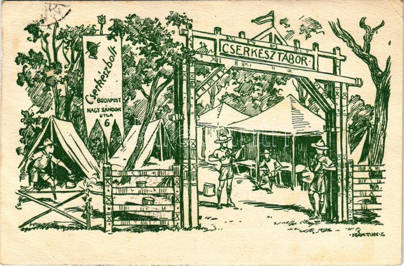 1935 Nemzetközi Árumintavásár Budapest 1934. A Cserkészbolt Mintatábora. Cserkészbolt csak a Cserkészházban Budapest V. Nagy Sándor utca 6. / Hungarian boy scout art postcard, display camp at the International Fair in Budapest s: Márton L. (EB)