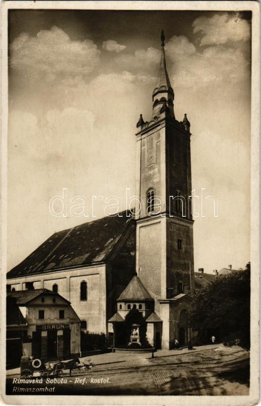 1939 Rimaszombat, Rimavská Sobota; Református templom, Braun Jenő üzlete / Ref. kostol / Calvinist church, shop (fa)