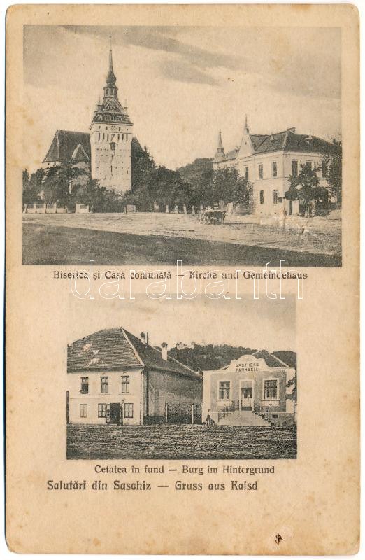 Szászkézd, Kaisd, Keisd, Saschiz; Biserica si Casa comunala, Cetatea in fund, Farmacia / Kirche und Gemeindehaus, Burg im Hintergrund, Apotheke / templom és községháza, vár és gyógyszertár / church and town hall, castle, pharmacy (fl)