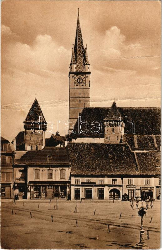 1947 Medgyes, Mediasch, Medias; Piata Regele Ferdinand. Hans Harth / Ferdinand király tér, M. Hann fodrász üzlete / square, shops, hairdresser (fa)