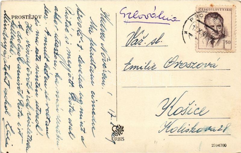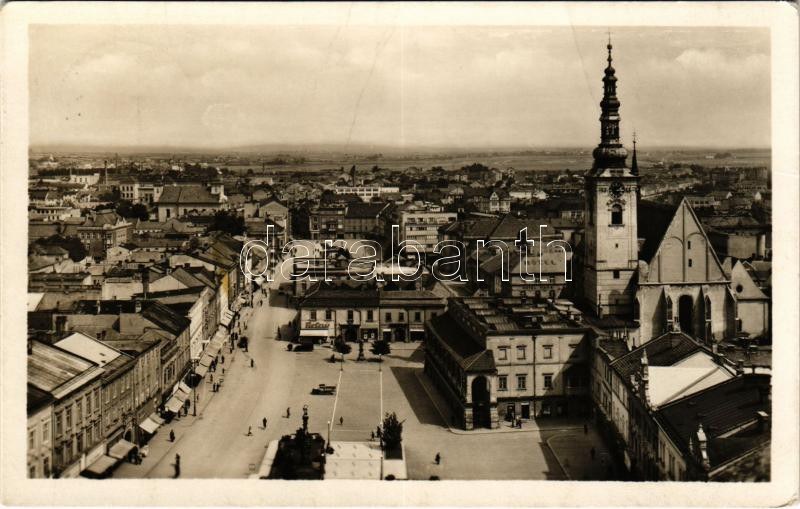 1949 Prostejov, Prossnitz; general view, square, shops, atuomobile (creases)