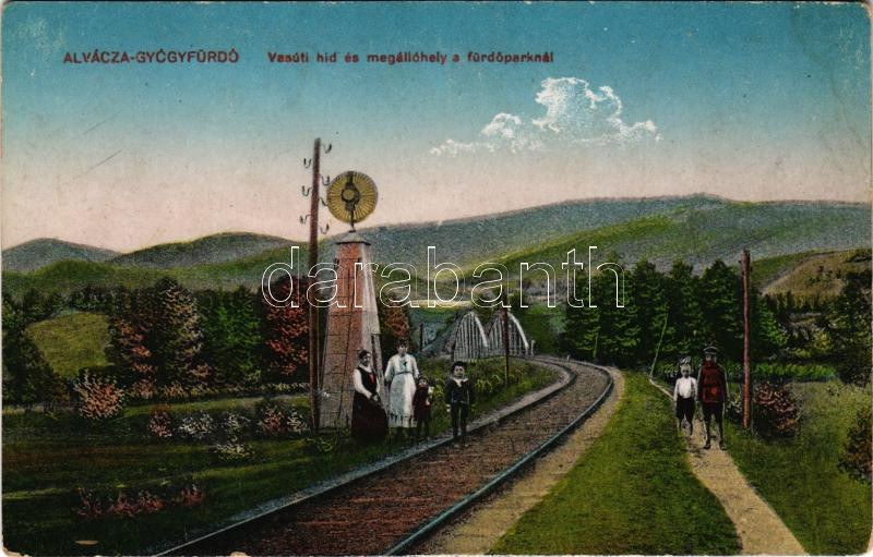 Alváca, Vata de Jos (Hunyad); vasúti híd és megállóhely a fürdőparknál, vasútállomás. Berkovits Izidor kiadása ...