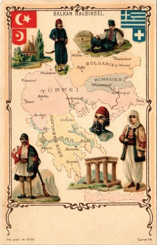 Balkan Halbinsel / Balkan Peninsula map, flags, folklore. Serie 74. Art Nouveau litho