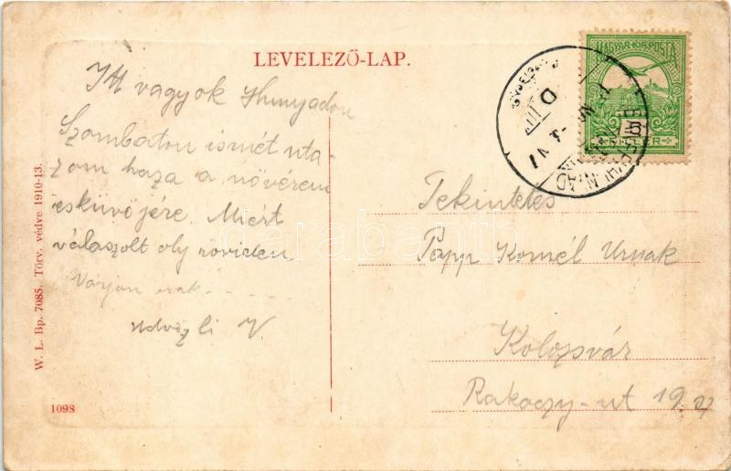 Bánffyhunyad, Huedin; Fő tér, piac, Református templom. W.L. Bp. 7085. 1910-13. / main square, church, market (kopott sarkak / worn corners)
