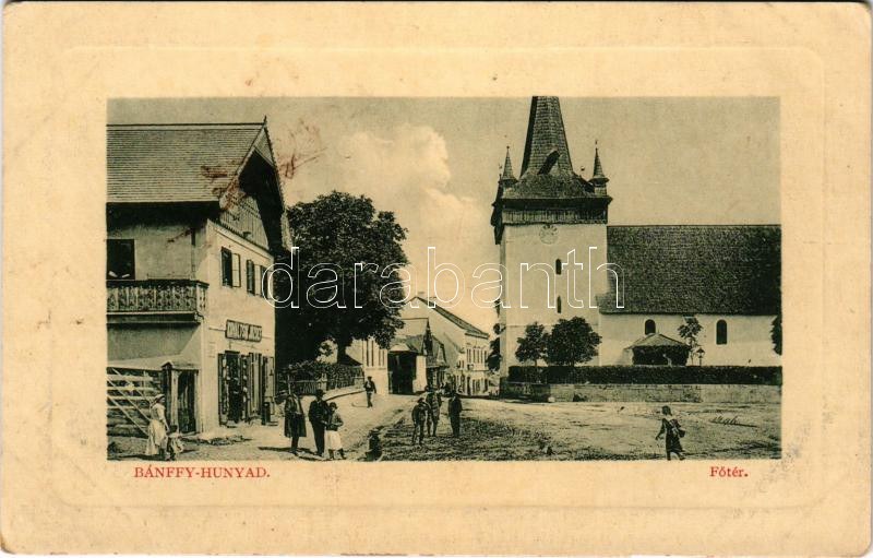 Bánffyhunyad, Huedin; Fő tér, Református templom, Kováltsik József üzlete. W.L. Bp. 7079. 1910-13. / main square...