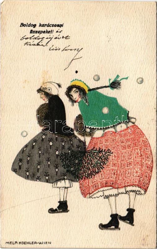 Boldog karácsonyi ünnepeket! Korcsolyázó hölgyek / Christmas greeting, ladies ice skating. B.K.W.I. 3121-4. s: Mela Koehler (EM)