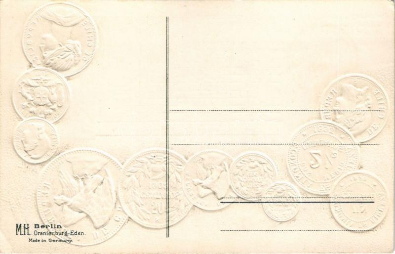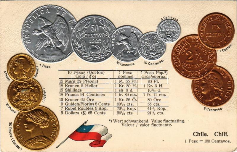 Chile / Chili / Set of coins, currency exchange chart and flag of Chile. M. H. Berlin-Oranienburg-Eden. Emb. litho (EK...