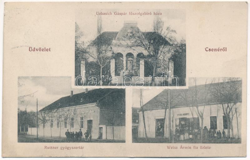 1912 Csene, Tschene, Cenej, Cenei; Uzbasich Gáspár főszolgabíró háza, Ruttner gyógyszertár...