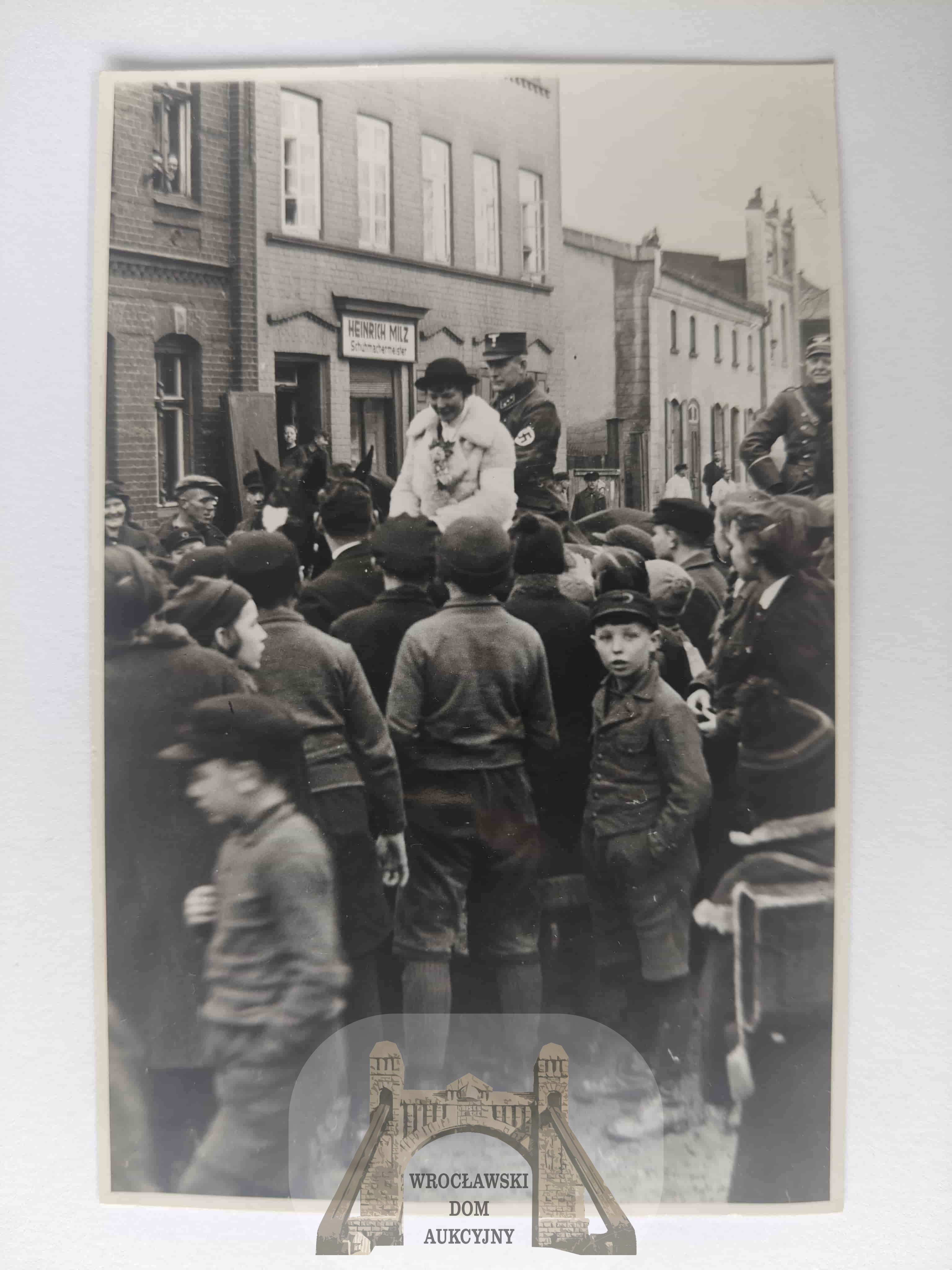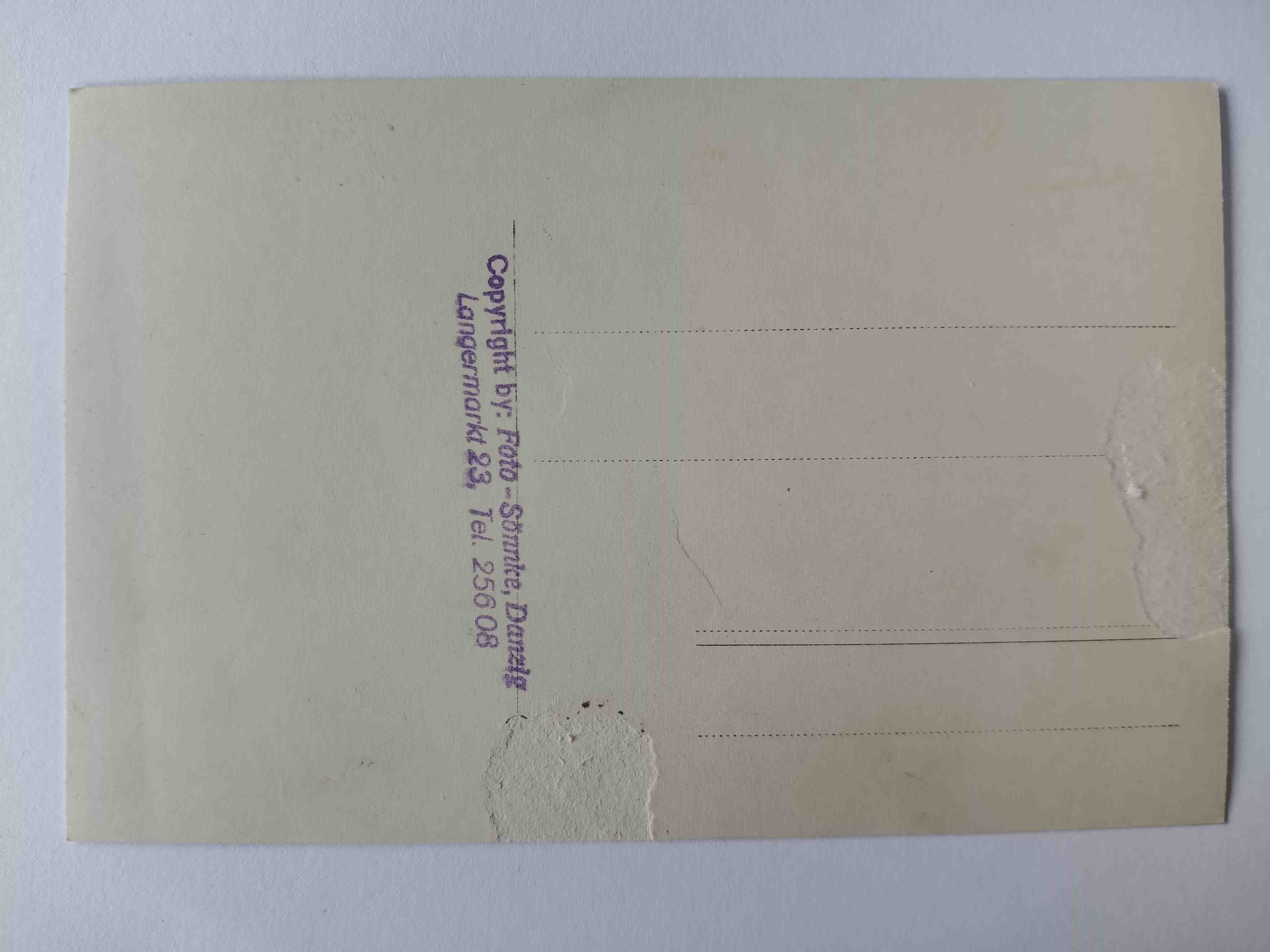 Przedmiotem licytacji jest oryginalna pocztówka, wydawca: foto Schoenke. Stan zachowania oraz obieg widoczny na fotografiach, niewielkie ślady kleju na rewersie i minimalne, płytkie ubytki jego powierzchni , nieznacznie przycięta do formatu ok. 8,5x13 cm, brak wad ukrytych.