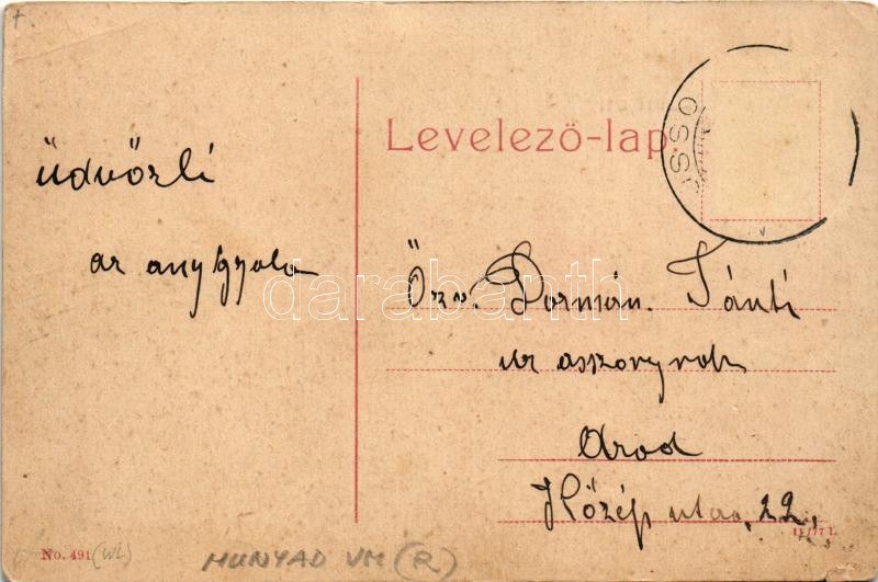 Déva, Fő tér, városháza, Lobstein Vilmos, Holtzer Károly, Szőcs F. Lajos, Hirsch Testvérek üzlete, lovaskocsik. No. 491. (W.L. ?) / main square, town hall, shops, horse-drawn carriages (kis szakadás / small tear)