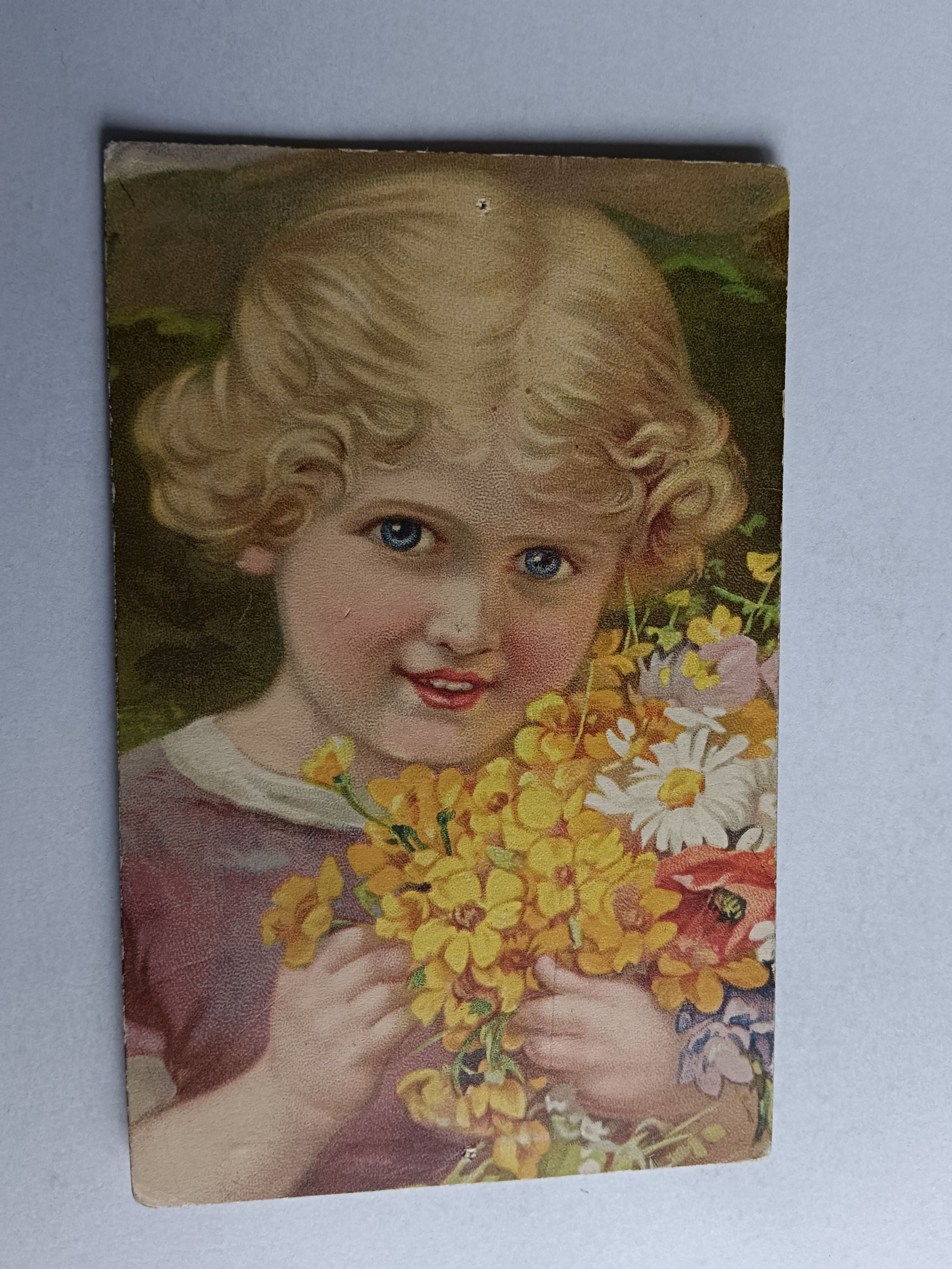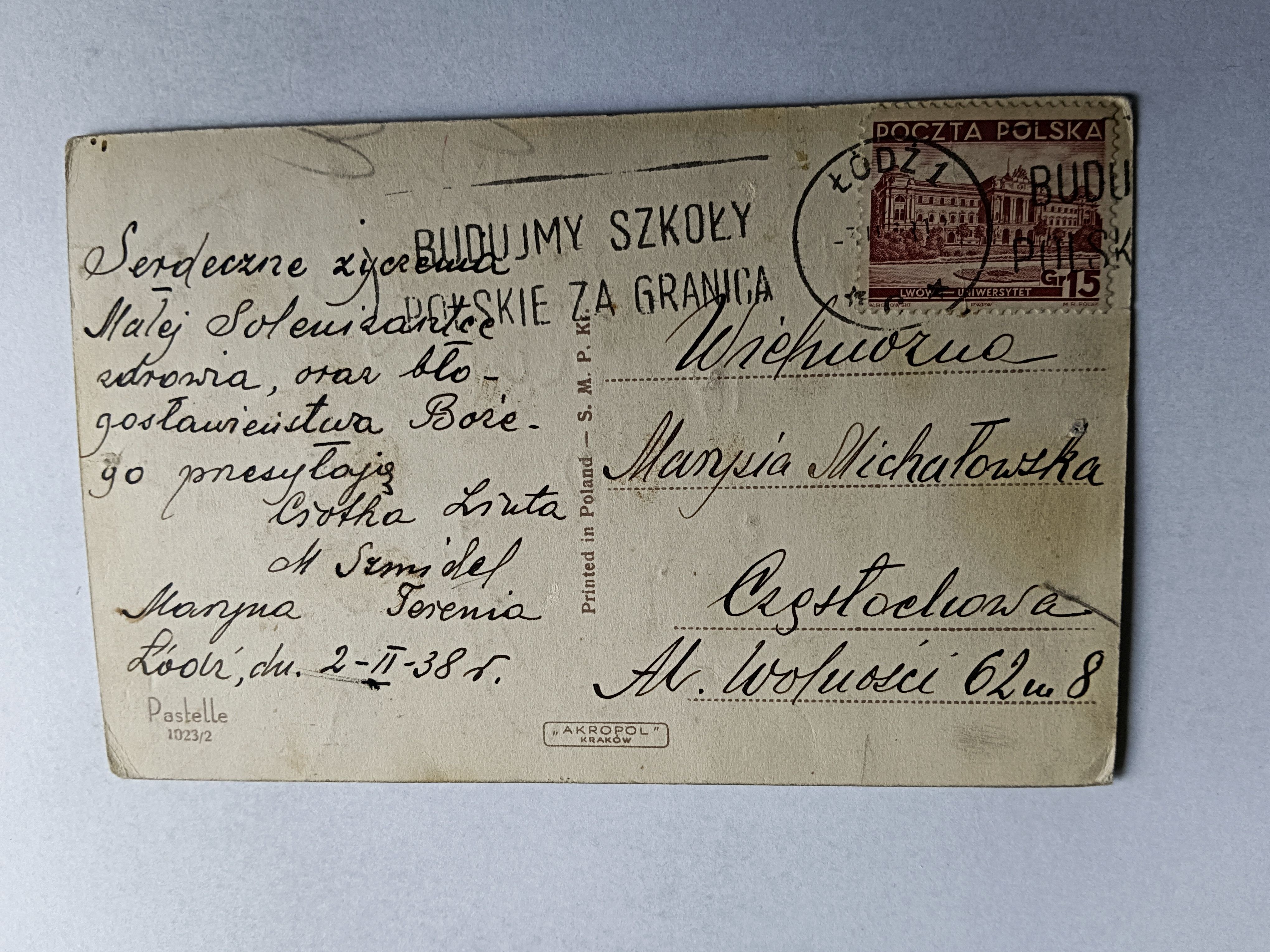 DZIEWCZYNKA KWIATY, STEMPEL ŁÓDŹ 1938 R, ZNACZEK, PIECZĄTKA BUDUJEMY POLSKIE SZKOŁY ZA GRANICĄ