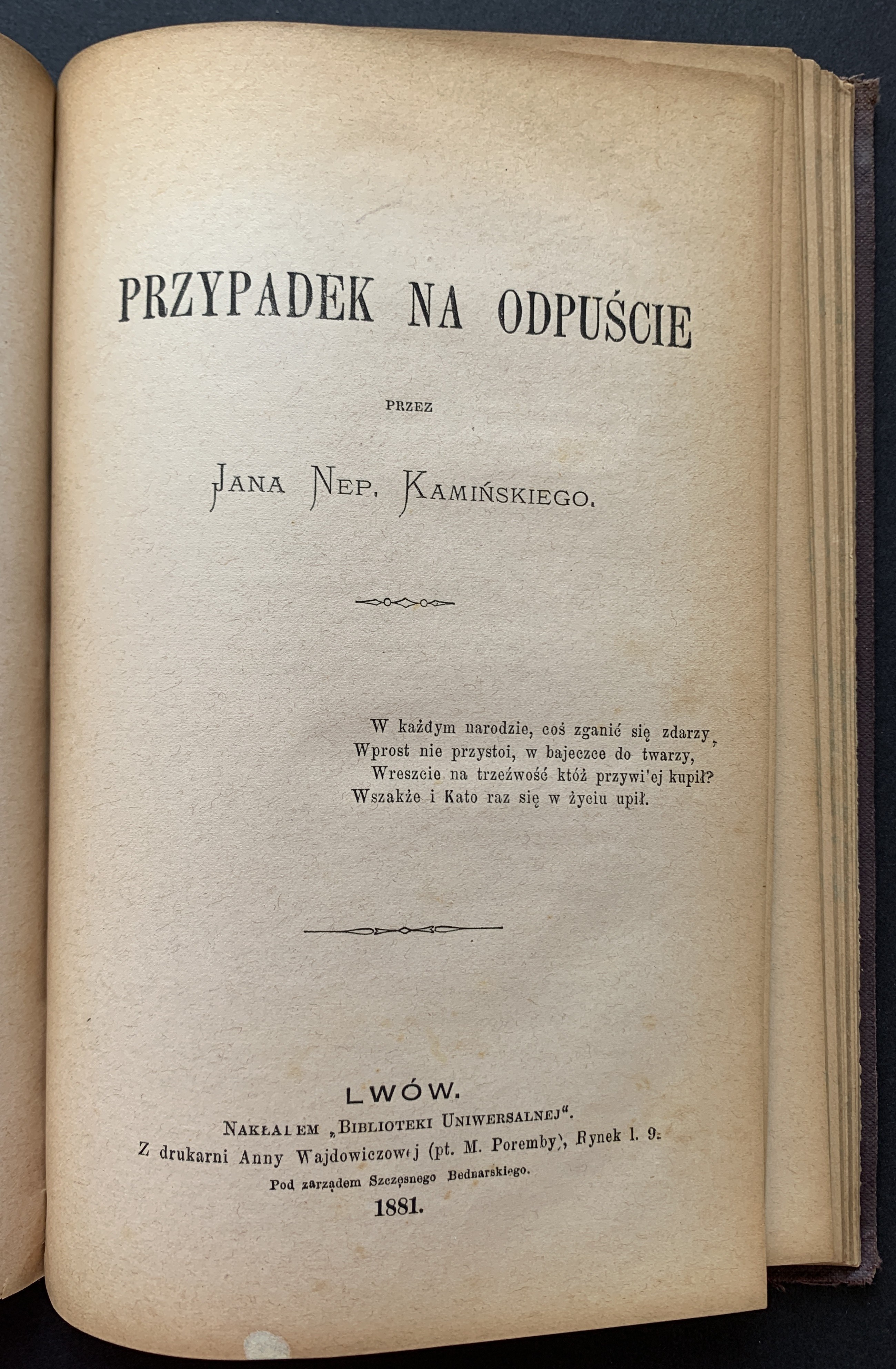 2. Jan Nepomucen Kamiński - Przypadek na odpuście. Lwów 1881, z drukar Anny Wajdowiczowej. Stron: 13.
