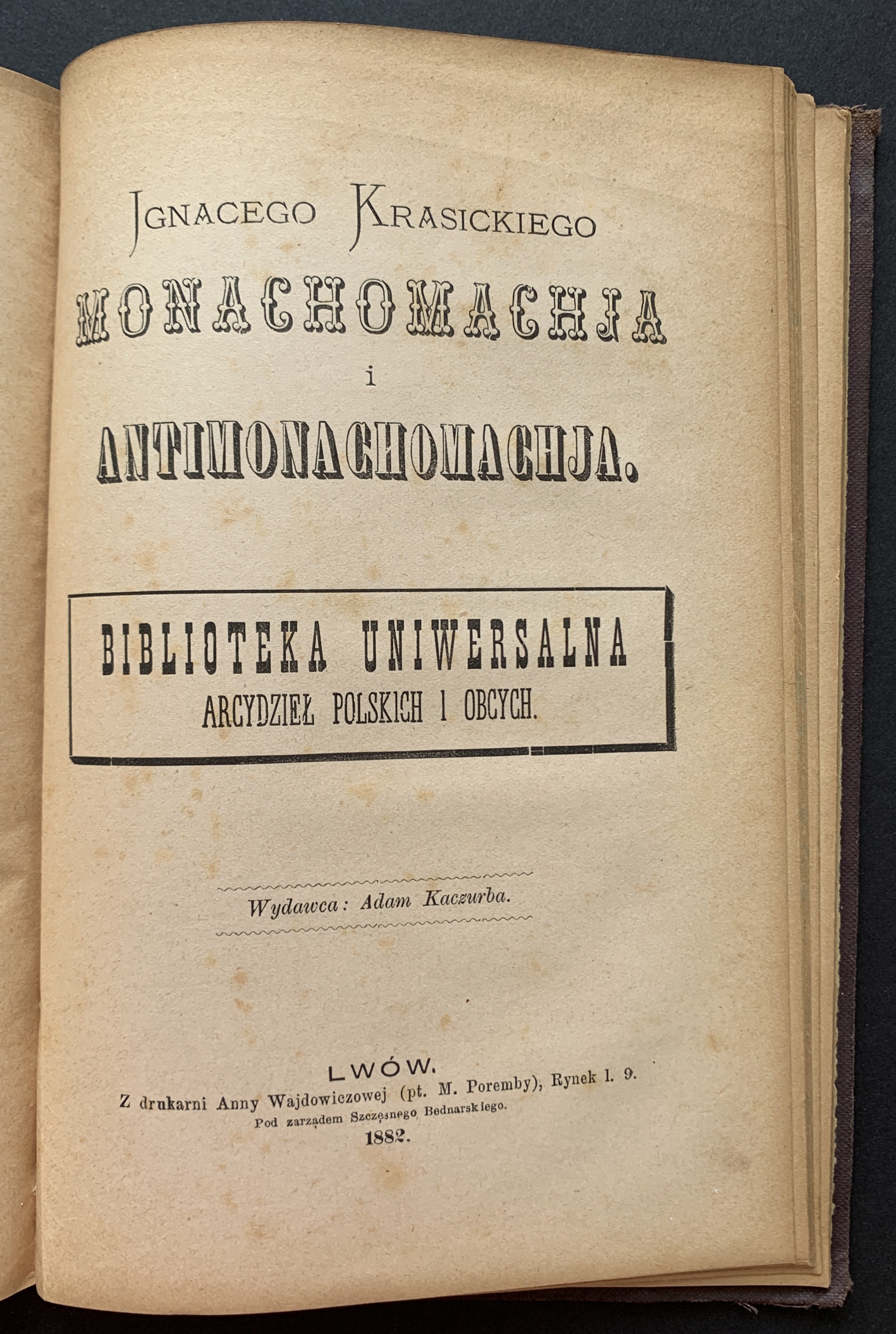 4. Ignacy Krasicki – Monachomacja i Antimonachomachja. Lwów 1882, z drukarni Anny Wajdowiczowej. Stron: 63.