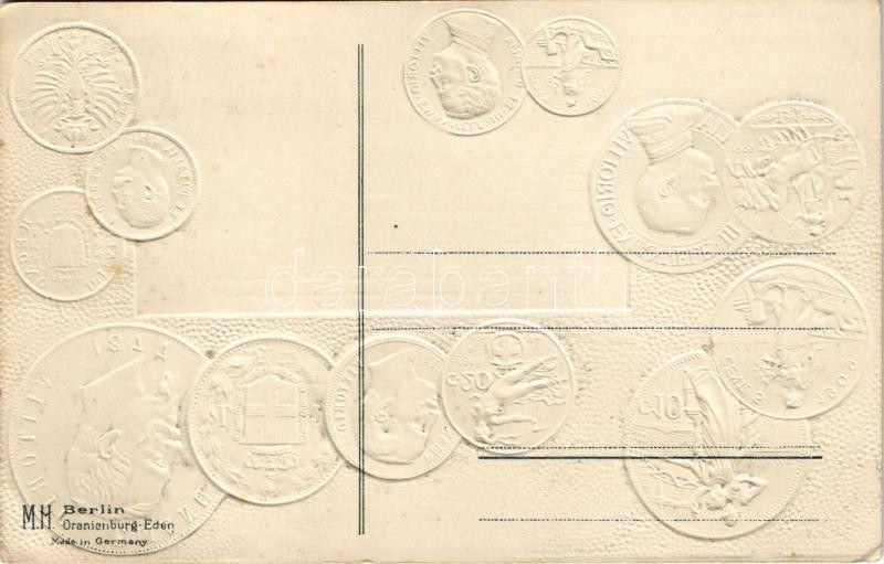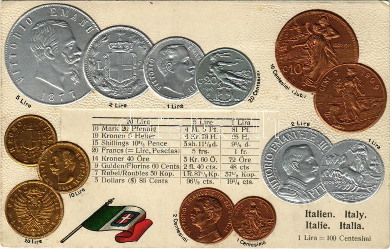 Italien / Italia / Set of coins, currency exchange chart and flag of Italy. M.H. Berlin-Oranienburg-Eden. Emb. litho (lyukak / pinholes)