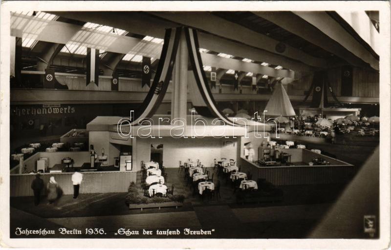 Jahresschau Berlin 1936. "Schau der tausend Freuden" / Magyar pavilon és étterem az 1936. évi berlini kiállításon, horogkeresztes zászlók / Hungarian pavilion and restaurant at the annual Berlin Exhibiton, swastika flags, NSDAP Nazi propaganda (EK)