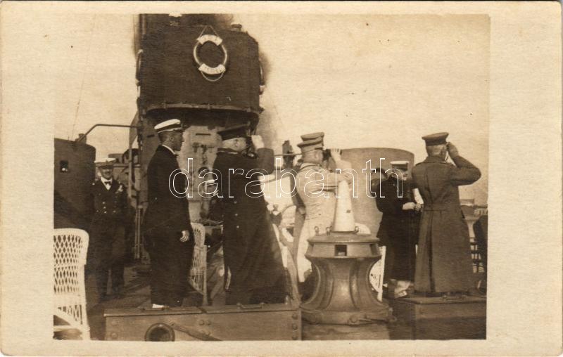K.u.K. Kriegsmarine Donauflottille / Császári és Királyi Haditengerészet Dunaflottilla "TEMES" monitor, August von Mackensen német tábornagy a fedélzeten tisztekkel / WWI Austro-Hungarian Navy Danube Fleet river guard monitor SMS TEMES with German Field Marshall August von Mackensen (first on the right, his back to the camera) stands on the deck at Sulina in 1918, looking through his fieldglasses, together with German and Habsburg army and navy officers. photo