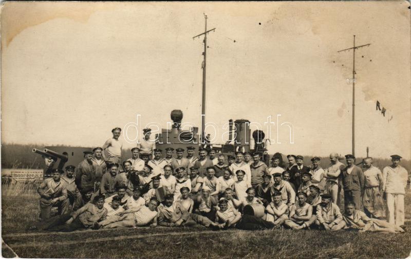 K.u.K. Kriegsmarine Matrosen Donauflottille / Császári és Királyi Haditengerészet Dunaflottilla SMS "SAVA" monitor matrózai a hajó előtt a szárazföldön / WWI Austro-Hungarian Navy Danube Flotilla river guard monitor SMS SAVA in front of the ship on land. photo (fl)