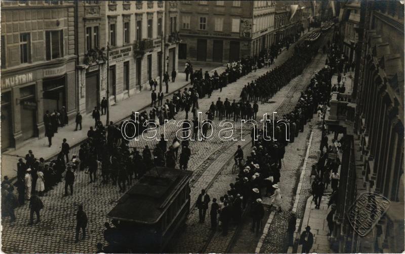 Ljubljana, Laibach; K.u.K. military parade, marching soldiers, tram, shops. Atelier J. Pogacnik photo