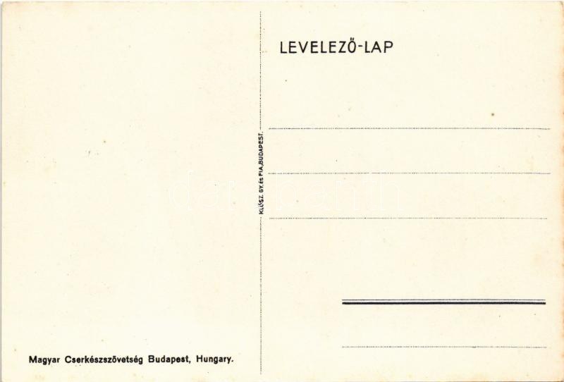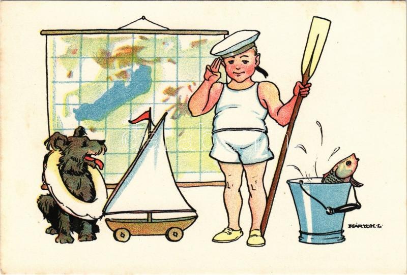 Magyar cserkész művészlap Balaton térképpel, játék vitorlással, kutyával és hallal. Magyar Cserkészszövetség, Klösz Gy. és Fia / Hungarian boy scout art postcard with Balaton map, toy sailboat, dog and fish s: Márton L. (fl)
