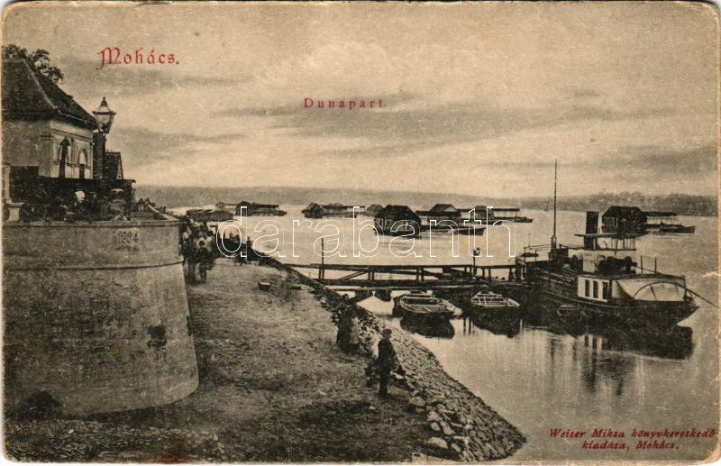 Mohács, Duna-part, hajómalom csoport a Dunán, hajóállomás. Weiser Miksa kiadása / floating / Danube riverside with floating ship mills (boat mills) (kopott sarkak / worn corners)