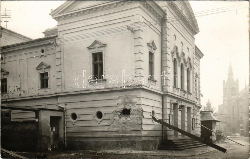 Munkács, Mukacheve, Mukachevo, Mukacevo; 1899-ben épült városi színház a harcok után, falán golyónyomokkal / theatre after attack. photo (EK)