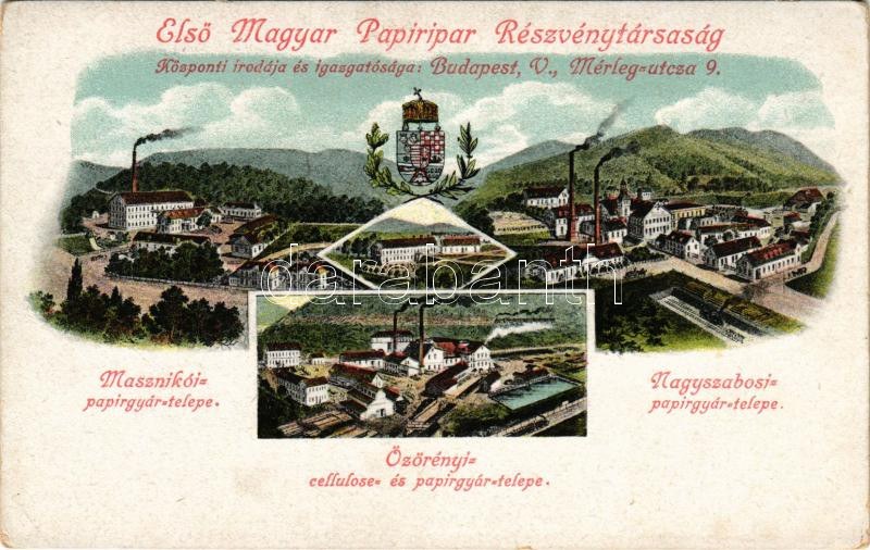 Nagyszabos, Nagyszlabos, Slavosovce; Első Magyar Papíripar Részvénytársaság budapesti központi iroda és igazgatóság, masznikói, özörényi és nagyszlabosi papírgyár telepek / First Hungarian Paper Industry's offices, paper mill and factory, advertisement card (non PC) (EK)