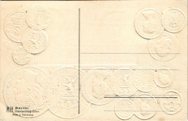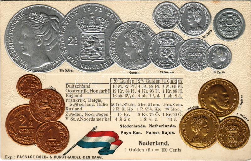 Nederland / Niederlande / Set of coins, currency exchange chart and flag of The Netherlands. M.H. Berlin-Oranienburg-Eden. Emb. litho (lyukak / pinholes)