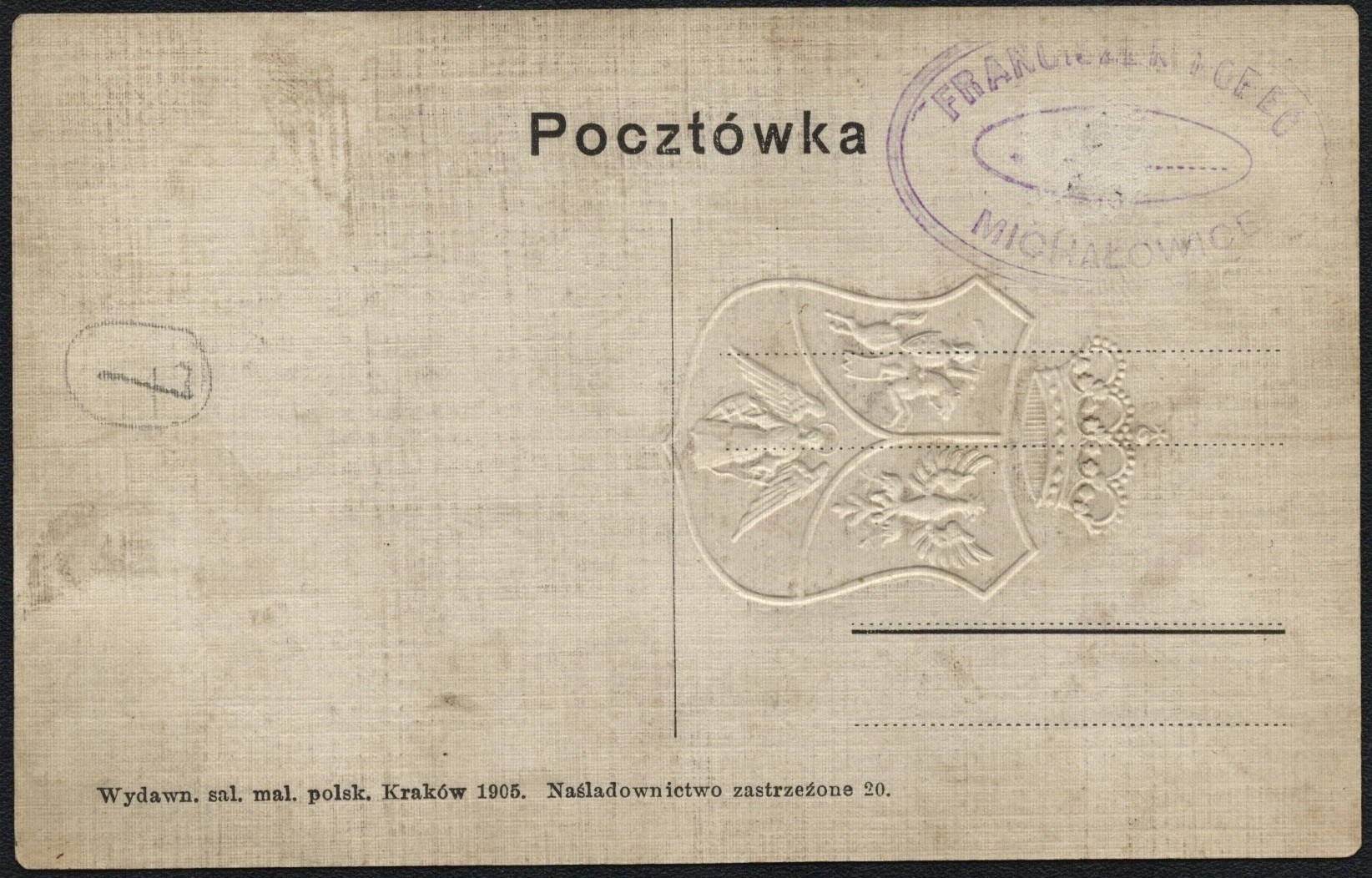 Wydawnictwo Salonu Malarzy Polskich w Krakowie 1905.] Pieczątka kolekcjonerska z tyłu: Franciszek Kopeć, Michałowice. Rewers niezapisany.