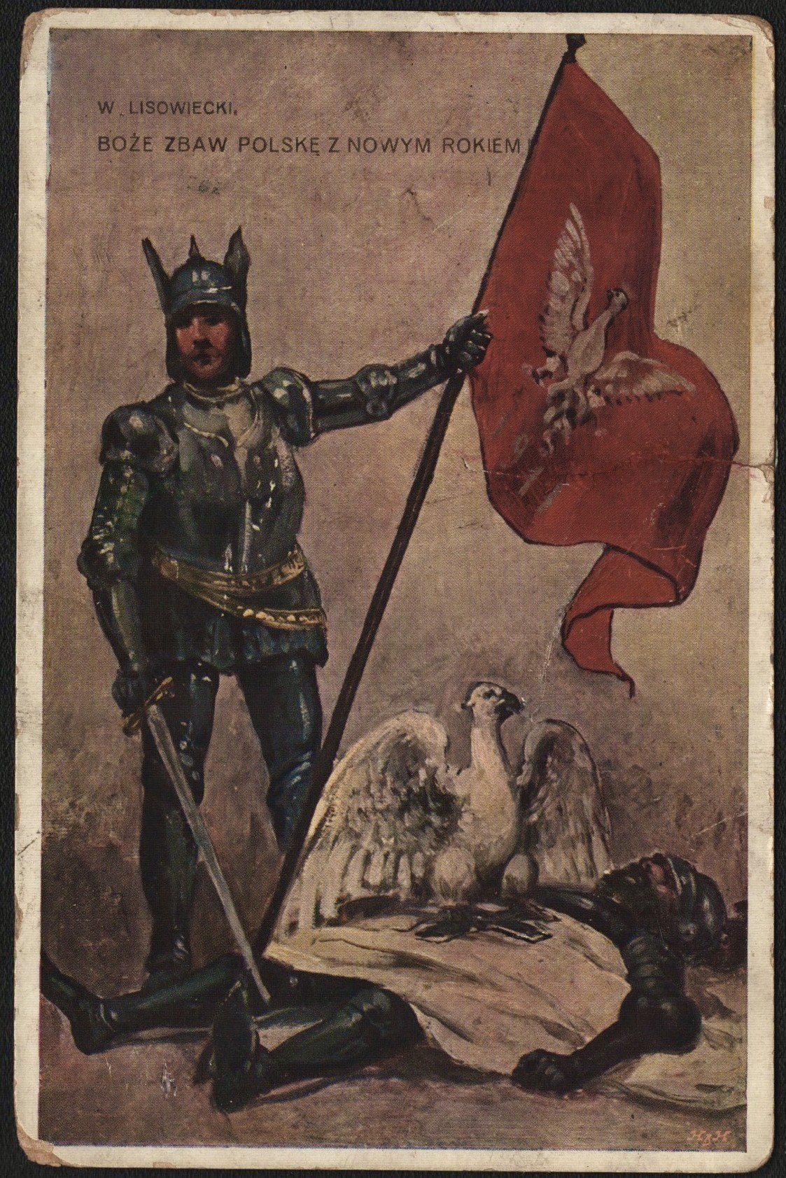 Pocztówka patriotyczna. Boże zbaw Polskę z Nowym Rokiem. Mal. M. Lisowiecki. Wydawnictwo "Pocztówki" w Krakowie]
