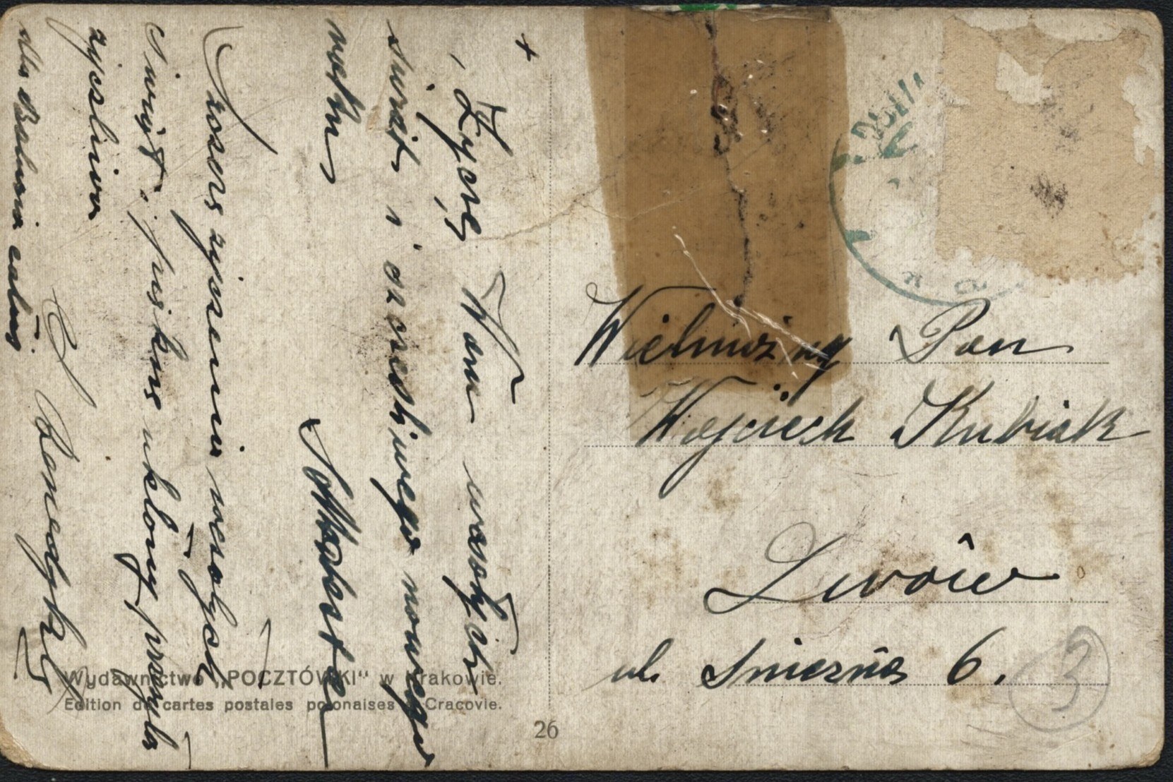 Druk barwny. Wym. 14 x 9,2 cm. Zapisana na rewersie. Ślady podklejeń taśmą, zabrudzenia.