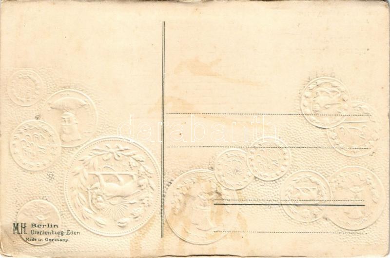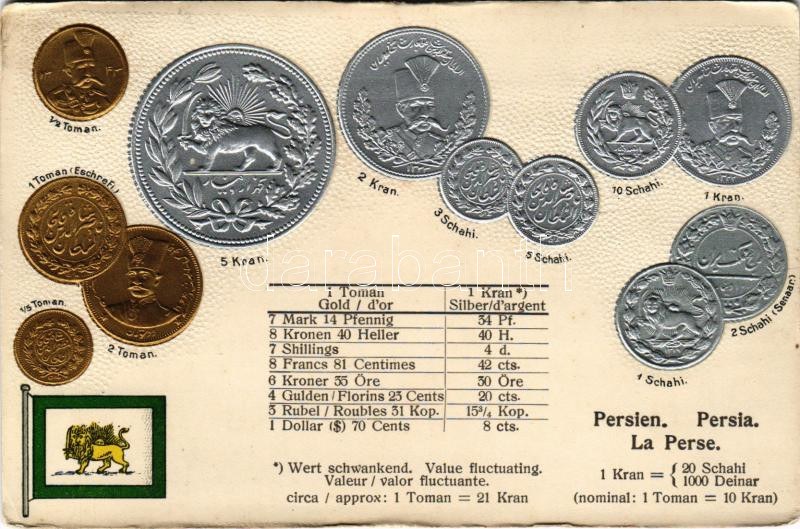 Persien / La Perse / Set of coins, currency exchange chart and flag of Persia. M. H. Berlin-Oranienburg-Eden. Emb. litho (vágott / cut)