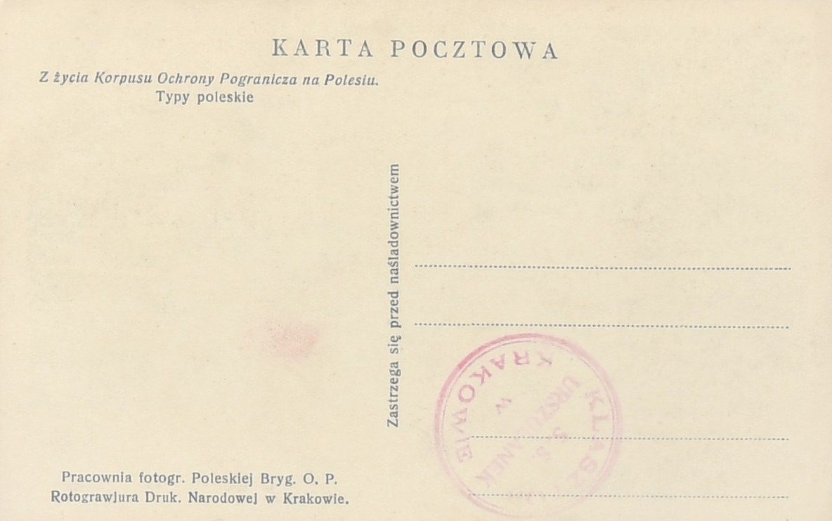 Typy poleskie. Pracownia fotogr. Poleskiej Bryg. O. P. Rotograwiura Druk. Narodowej w Krakowie. Kartka bez obiegu. Stan bardzo dobry.