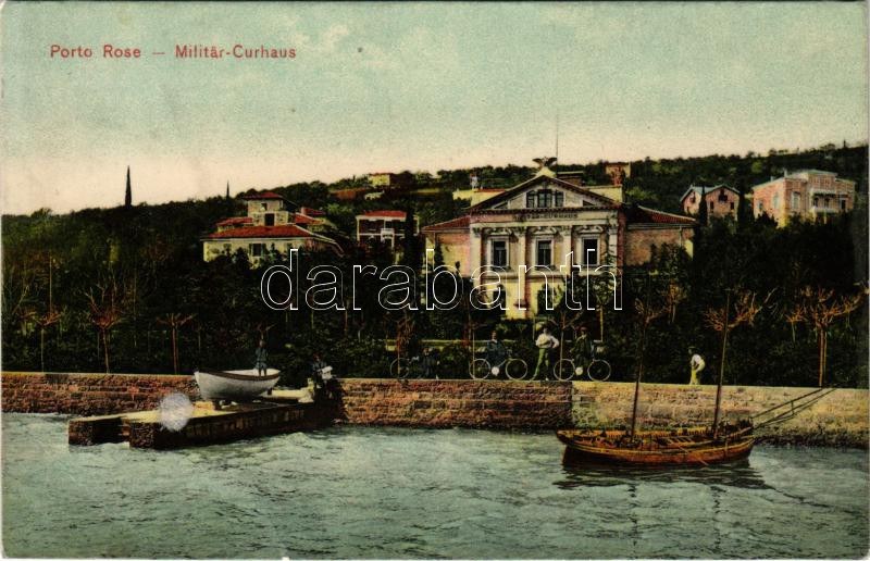 Portoroz, Porto Rose (Piran, Pirano); Militär-Curhaus. Francesco Heizinger / military spa, men with bicycles, ships...