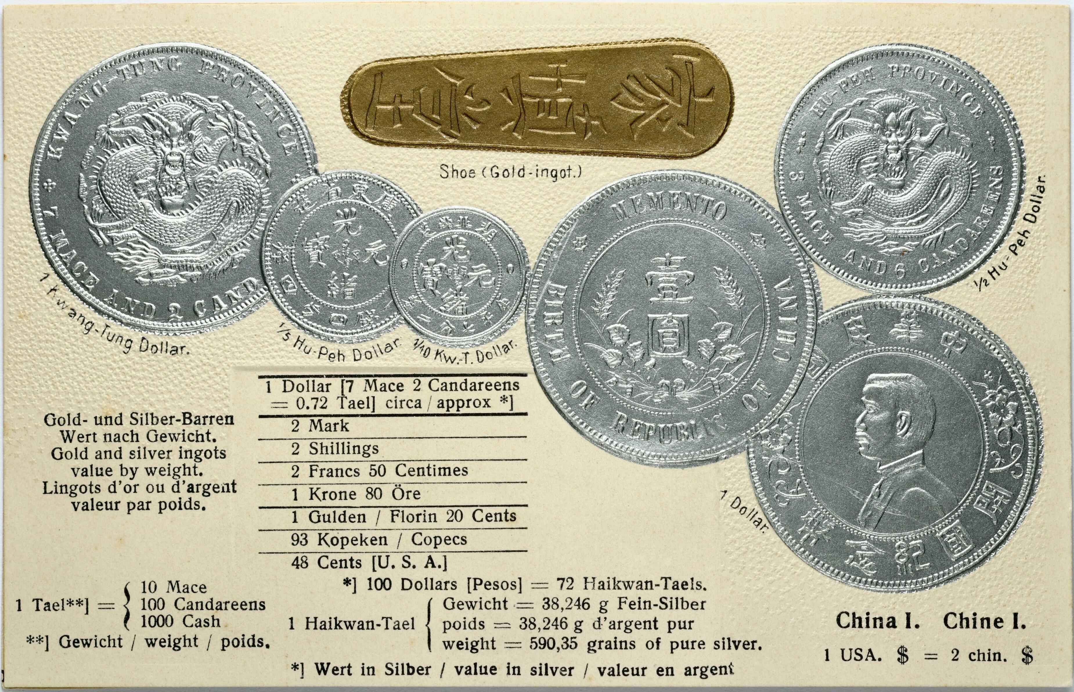 Postcard ND (1930) with coins of China I. Printed in Germany. Paper. 91x143 mm.