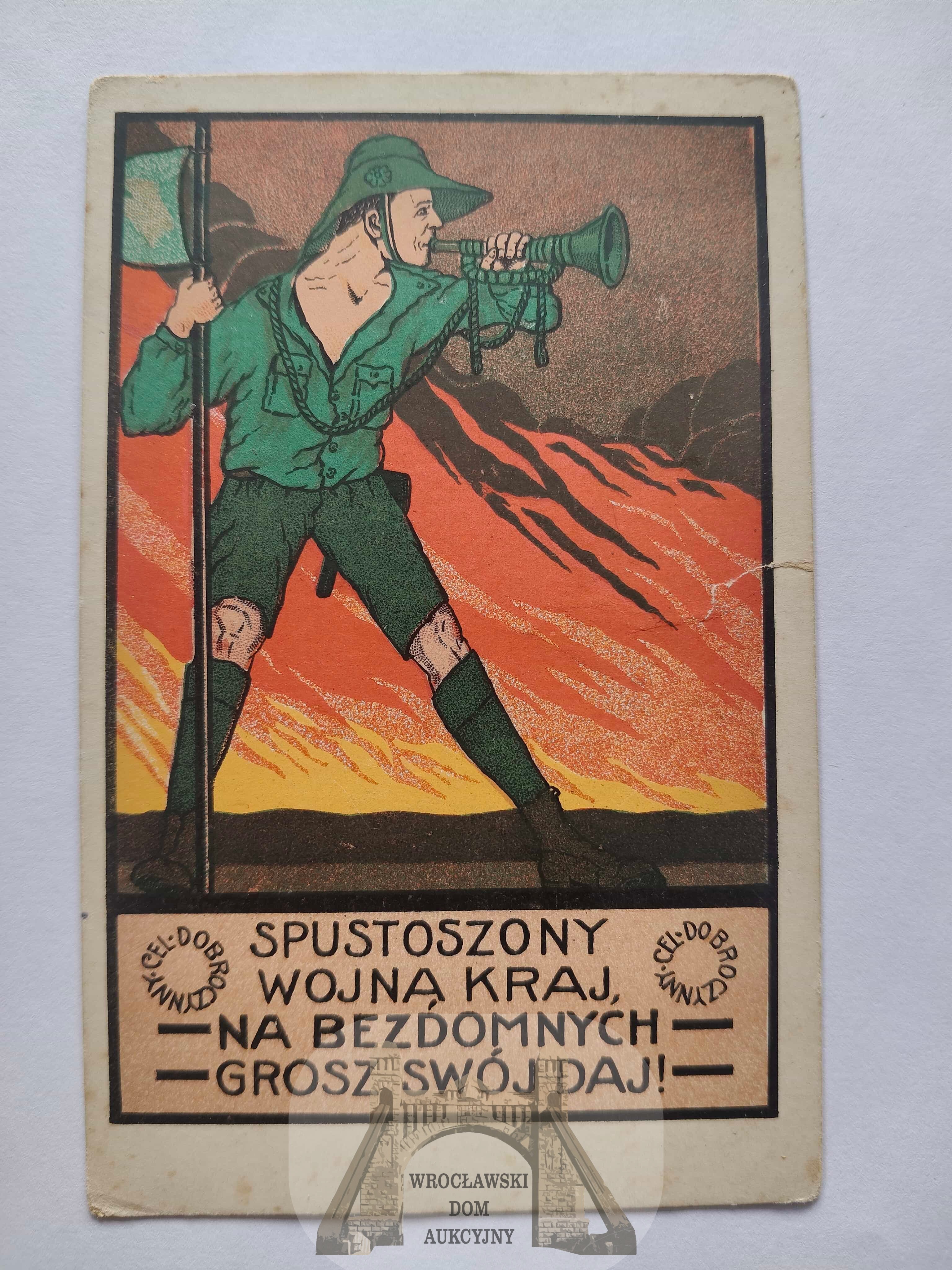 Przedmiotem licytacji jest oryginalna pocztówka. Stan zachowania oraz obieg widoczny na fotografiach, naddarcie ok. 10 mm, brak wad ukrytych.