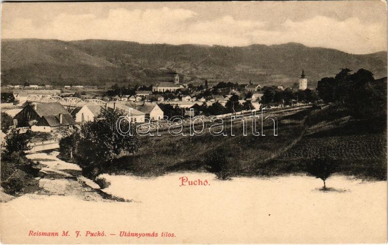Puhó, Púchov; látkép, templom, híd, vasútvonal, zsinagóga. Reismann M. kiadása / general view, church, bridge, railway line, synagogue