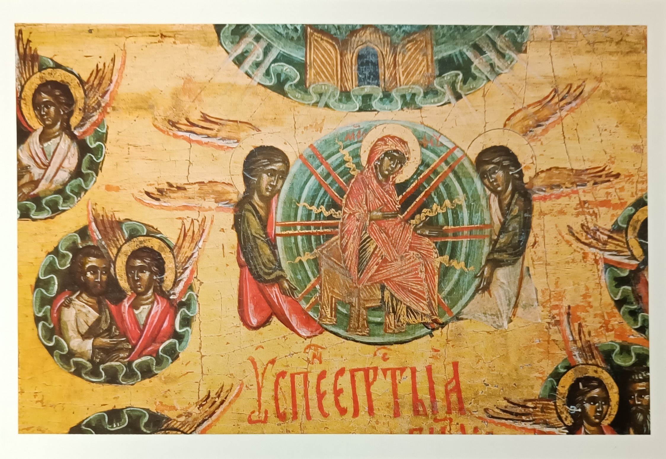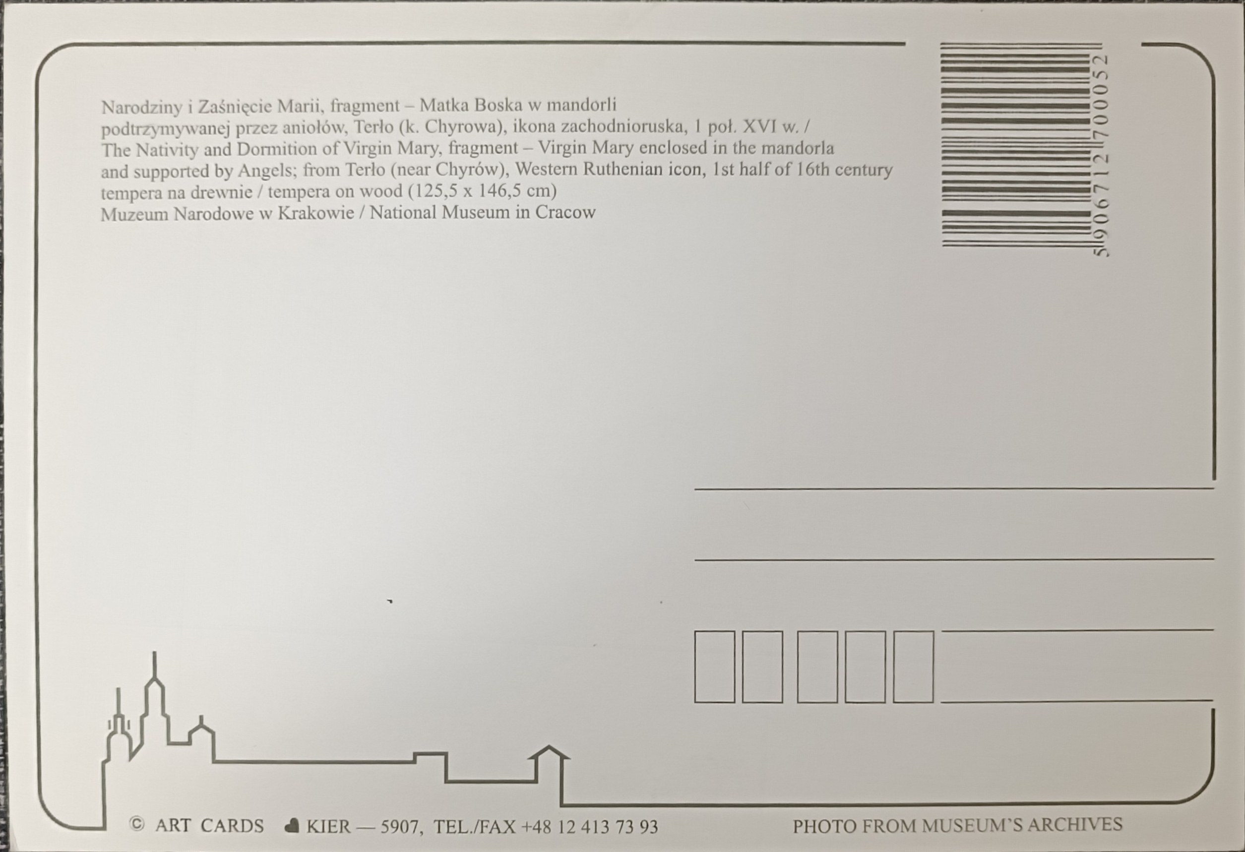 Kolorowa pocztówka z reprodukcją ikony, przedstawiającej Narodziny i Zaśnięcie Marii, ze zbiorów Muzeum Narodowego w Krakowie.