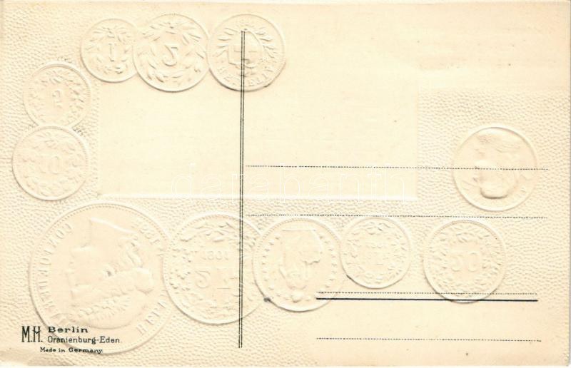 Schweiz. Münzenkarte und Nationalflagge / Swiss set of coins, currency exchange chart and flag. Emb. litho (lyuk / pinhole)