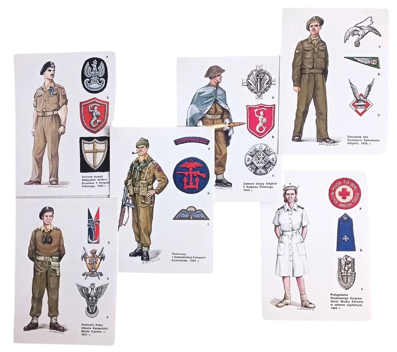 Zestaw kart z kolekcji "Mundur i godło", wydanych przez Wydawnictwo FENIX. Komplet składa sie z 6 kart pocztowych, każda z nich przedstawia umundurowanie wybranej jednostki, odznaki pułkowe lub pamiątkowe, oraz stopnie wojskowe.