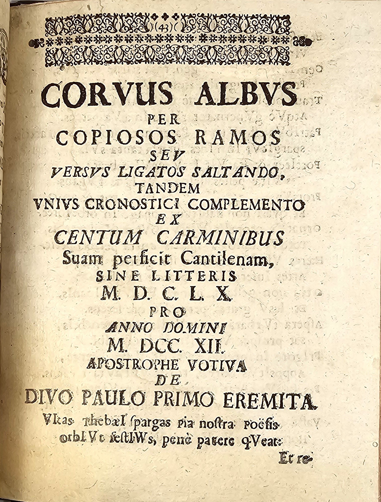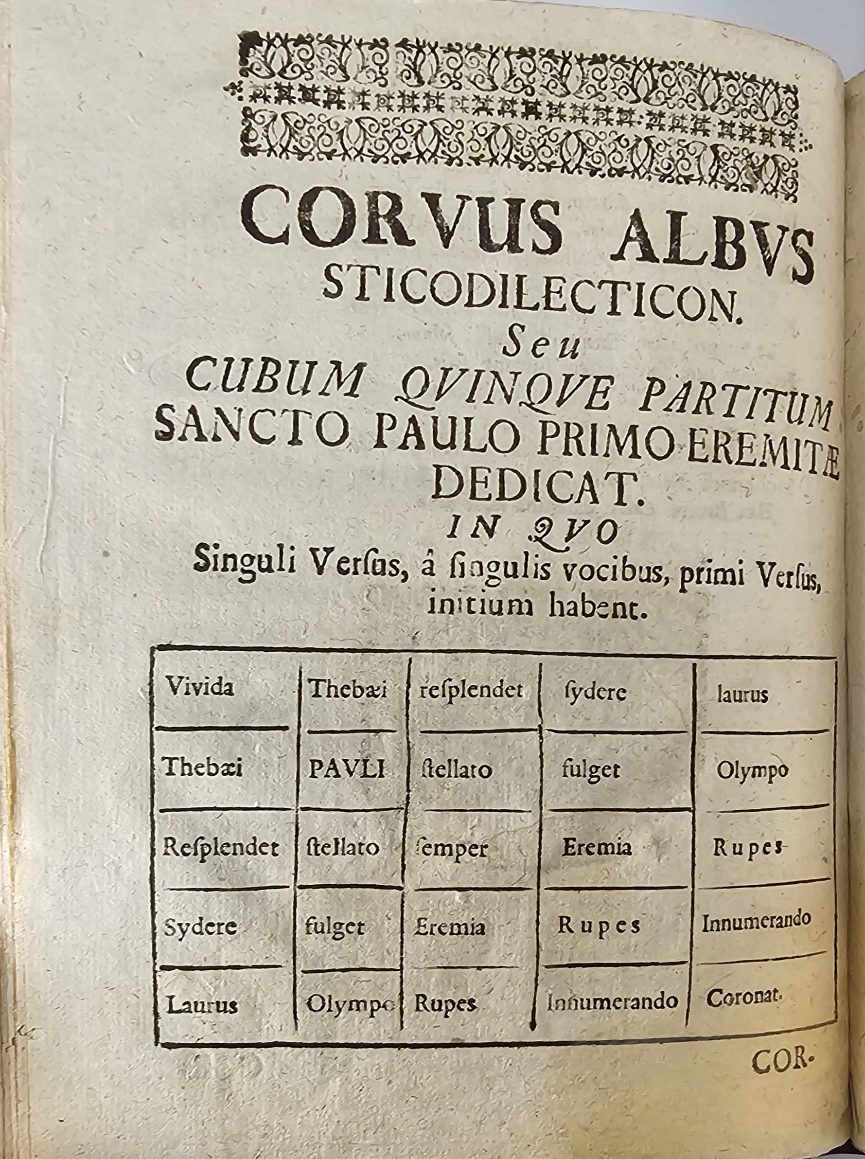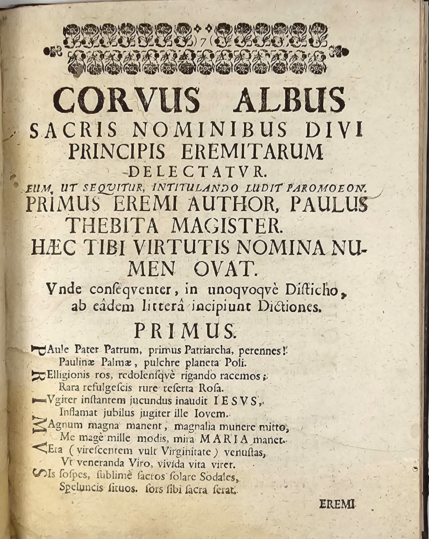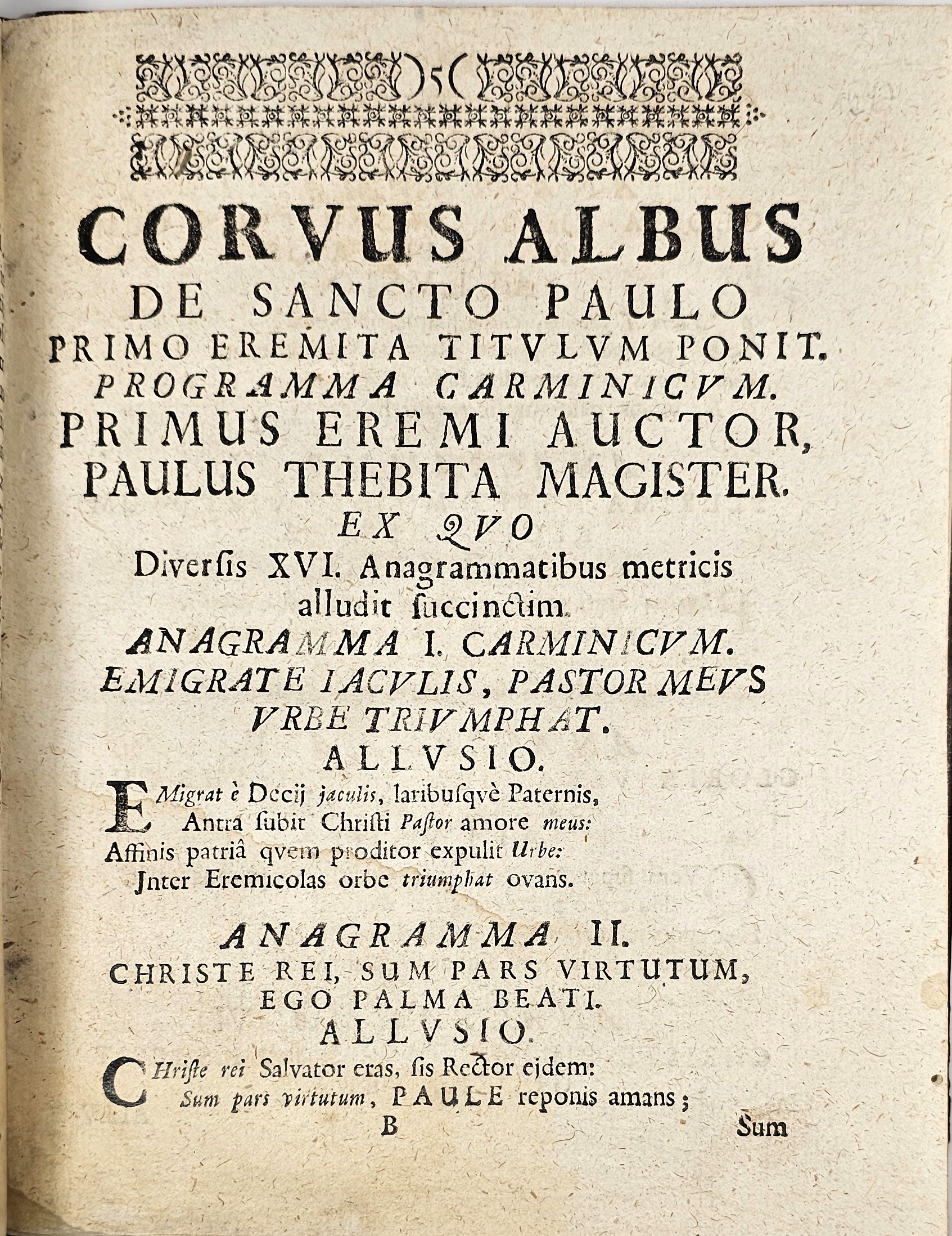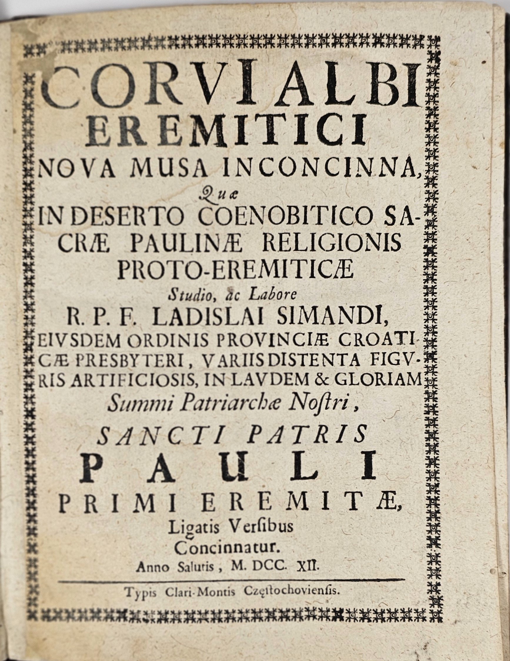20.5 cm, s. [4], 68, [6], opr. sk. konserwacji introlig. Pierwsze 33 karty podklejone bibułką, od str. 53 do końca na wew. marginesach podklejone ślady po korniku. Wszystkie interwencje przeprowadzono fachowo, dzięki czemu stan zachowania śmiało ocenić można jako dobry. Tom łacińskiej poezji wizualnej i kombinatorycznej, poświęcony św. Pawłowi eremicie, zawiera próbki poezji wizualnej (carmina figurata), wiersze wzorcowe (versus intexti), rebusy i róże typy wersetów kombinatorycznych (anagramy, akrostychy czy palindromy).[G. Stepanic,The Josephus Problem in the Latin Combinatorial Poetry of Ladislaus Simandi (1655-1715)]. Bardzo rzadkie.