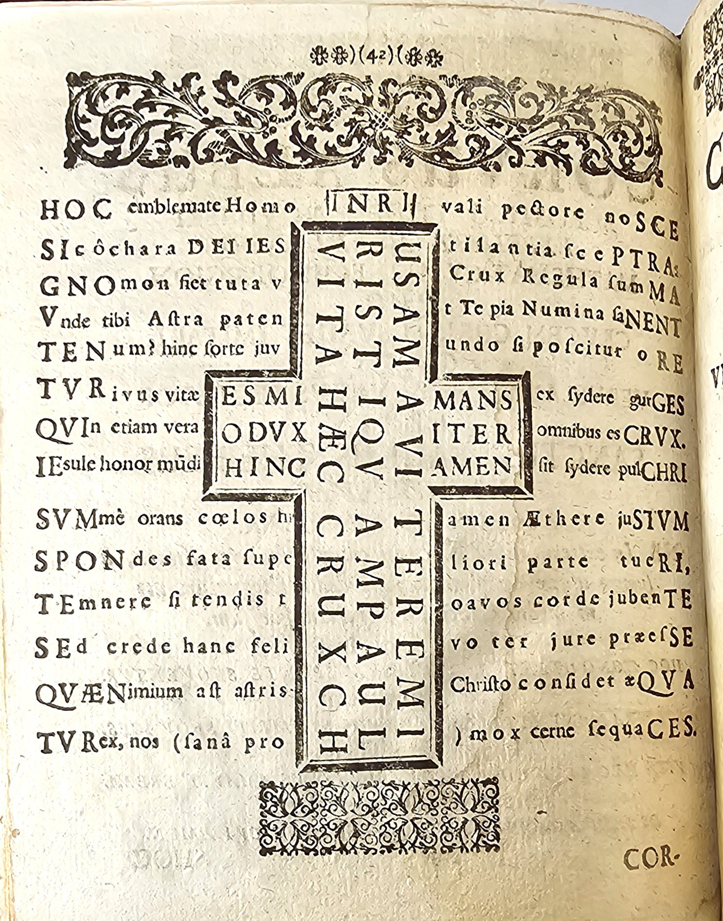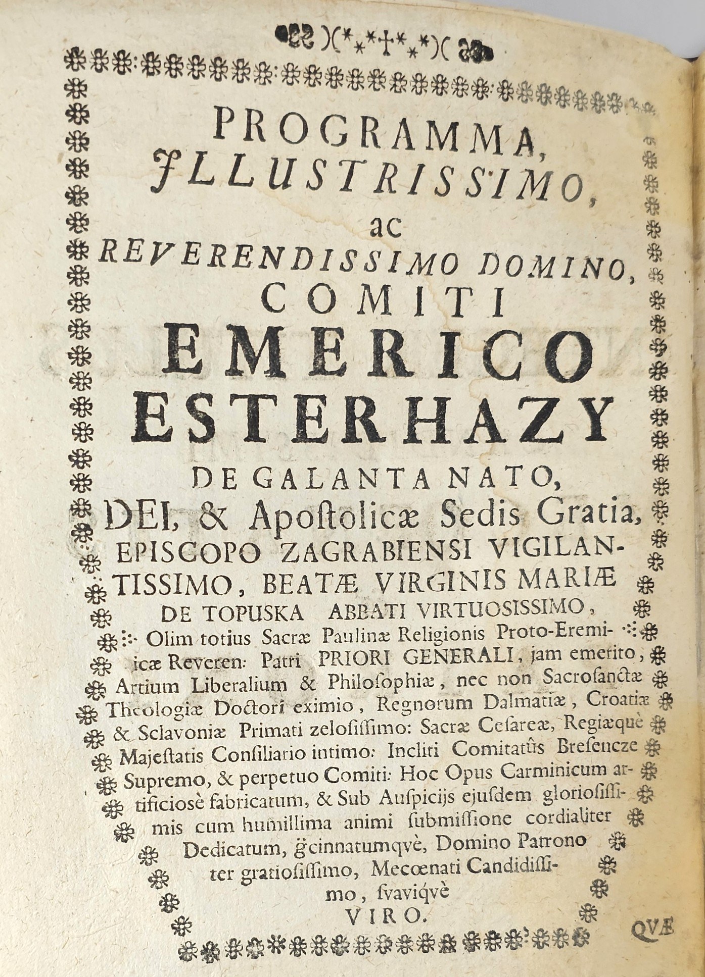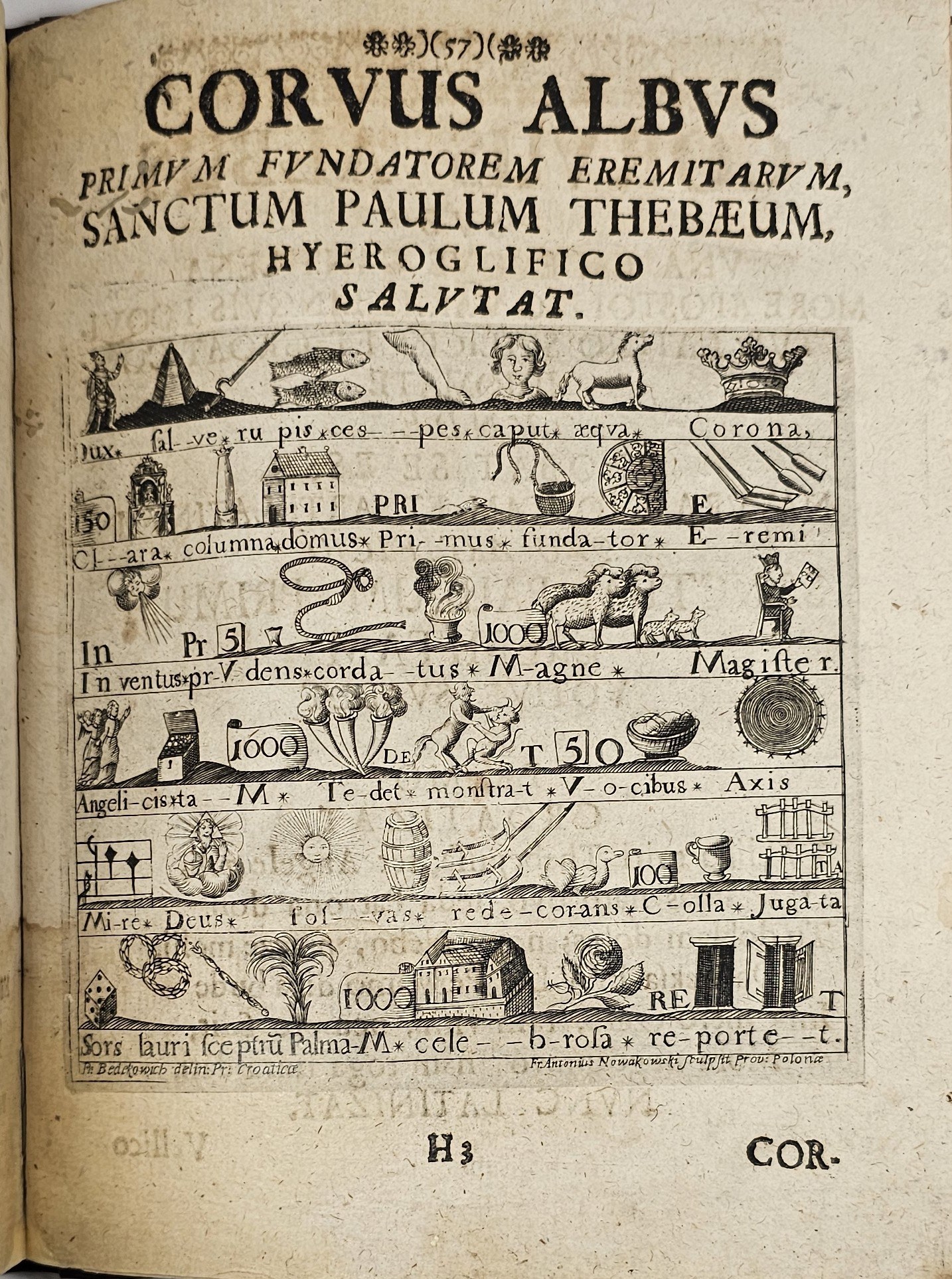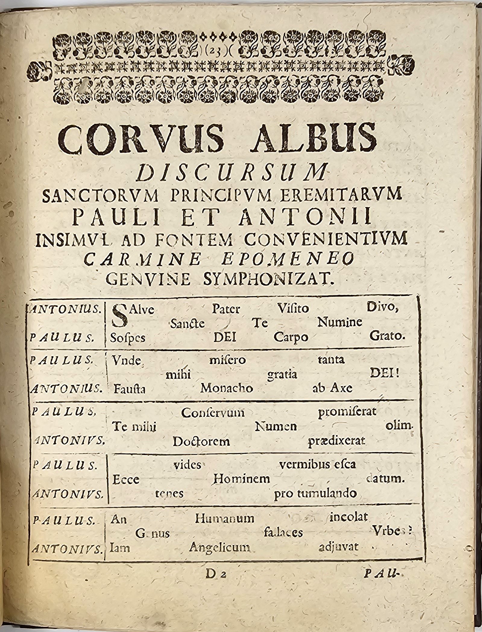 20.5 cm, s. [4], 68, [6], opr. sk. konserwacji introlig. Pierwsze 33 karty podklejone bibułką, od str. 53 do końca na wew. marginesach podklejone ślady po korniku. Wszystkie interwencje przeprowadzono fachowo, dzięki czemu stan zachowania śmiało ocenić można jako dobry. Tom łacińskiej poezji wizualnej i kombinatorycznej, poświęcony św. Pawłowi eremicie, zawiera próbki poezji wizualnej (carmina figurata), wiersze wzorcowe (versus intexti), rebusy i róże typy wersetów kombinatorycznych (anagramy, akrostychy czy palindromy).[G. Stepanic,The Josephus Problem in the Latin Combinatorial Poetry of Ladislaus Simandi (1655-1715)]. Bardzo rzadkie.