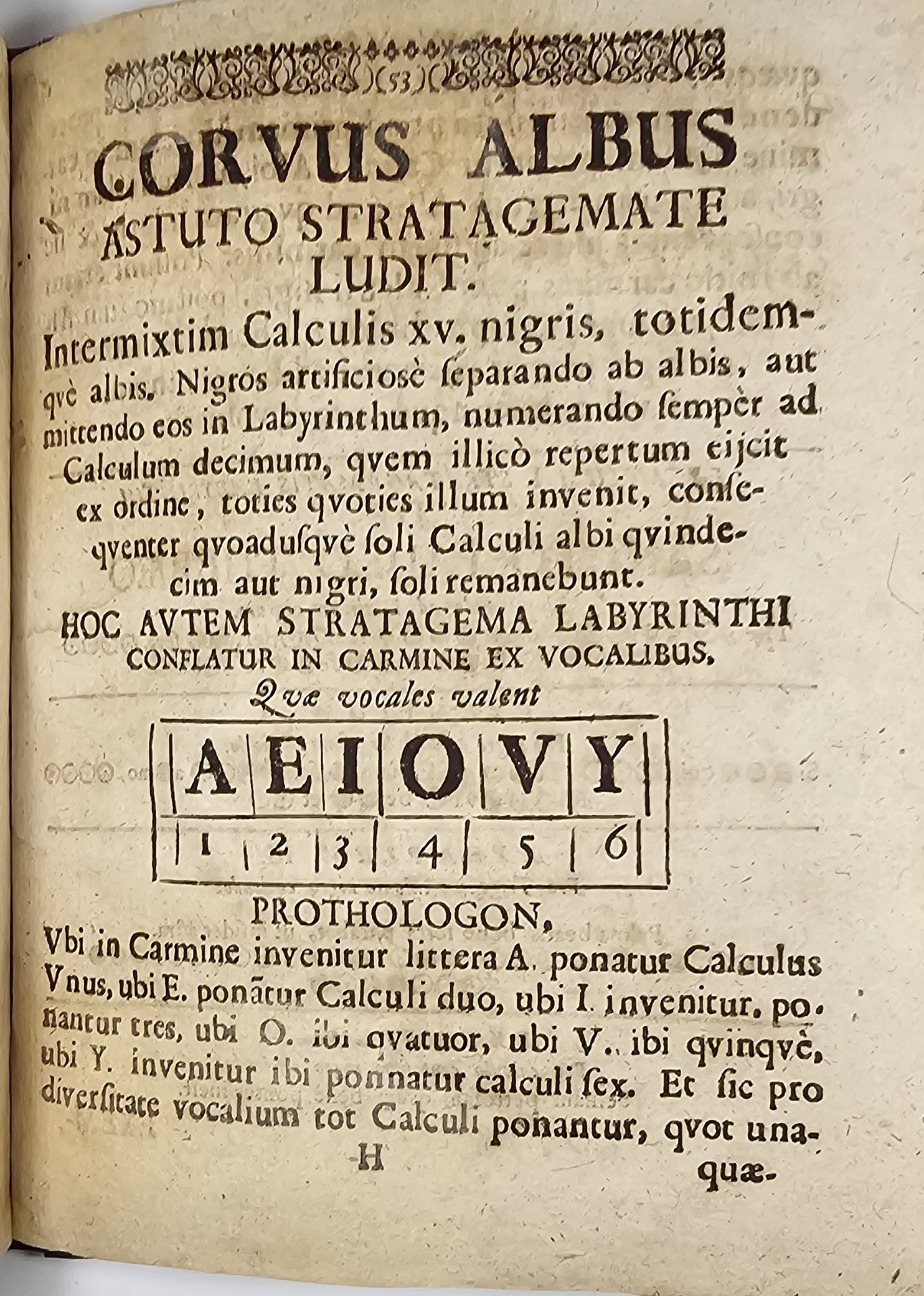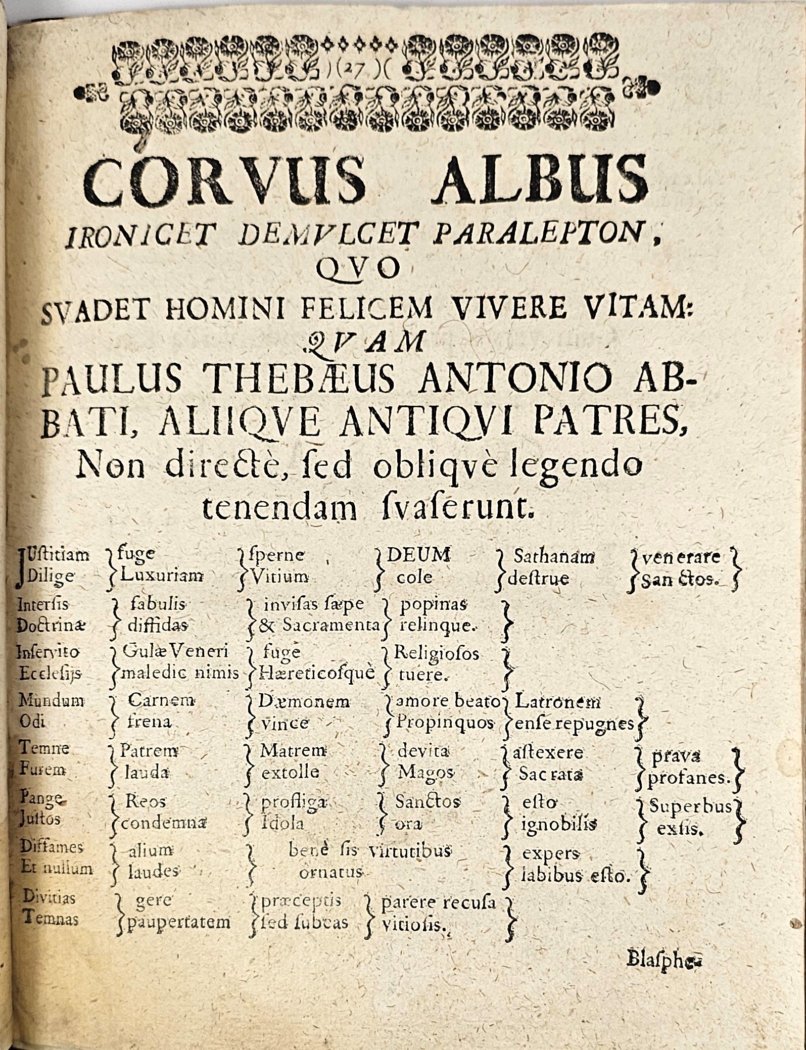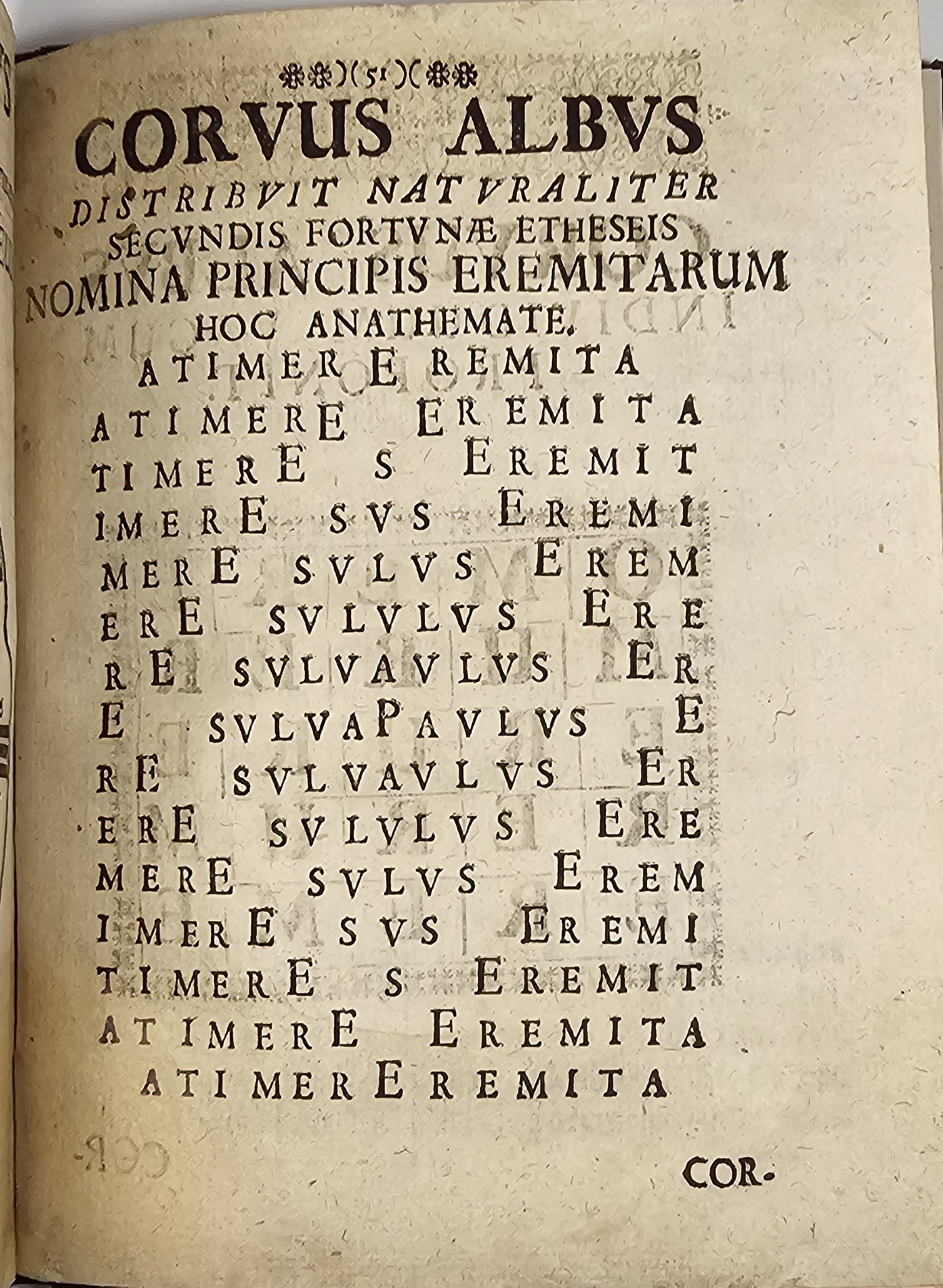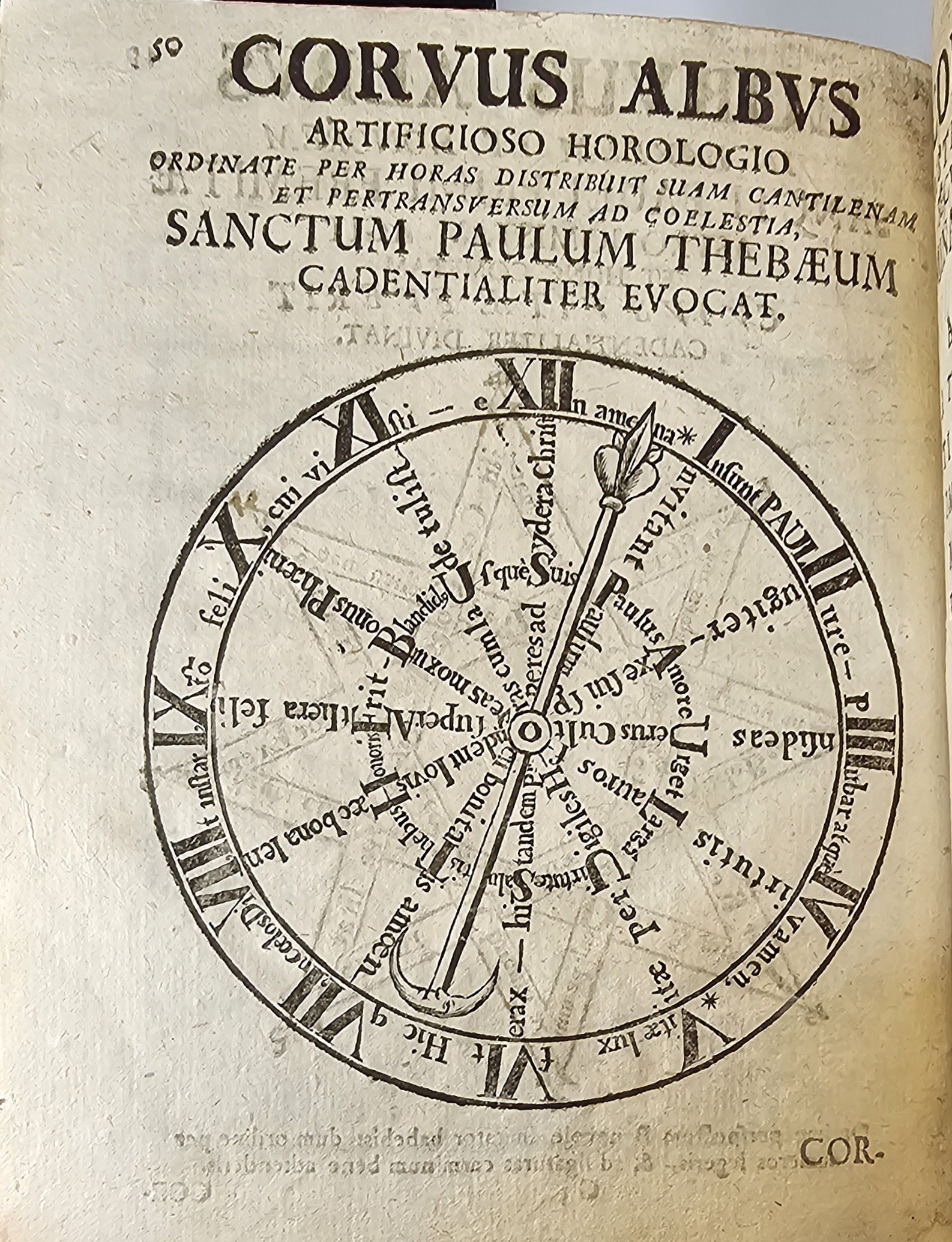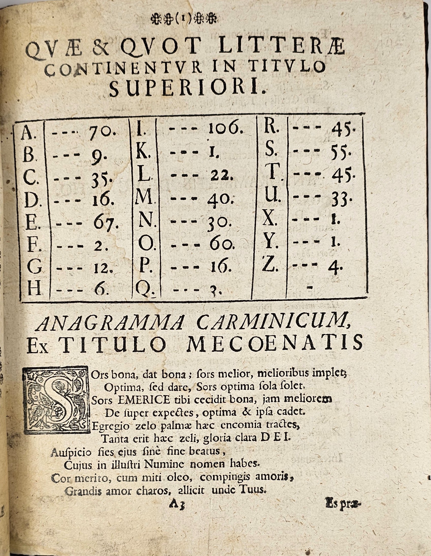 20.5 cm, s. [4], 68, [6], opr. sk. konserwacji introlig. Pierwsze 33 karty podklejone bibułką, od str. 53 do końca na wew. marginesach podklejone ślady po korniku. Wszystkie interwencje przeprowadzono fachowo, dzięki czemu stan zachowania śmiało ocenić można jako dobry. Tom łacińskiej poezji wizualnej i kombinatorycznej, poświęcony św. Pawłowi eremicie, zawiera próbki poezji wizualnej (carmina figurata), wiersze wzorcowe (versus intexti), rebusy i róże typy wersetów kombinatorycznych (anagramy, akrostychy czy palindromy).[G. Stepanic,The Josephus Problem in the Latin Combinatorial Poetry of Ladislaus Simandi (1655-1715)]. Bardzo rzadkie.
