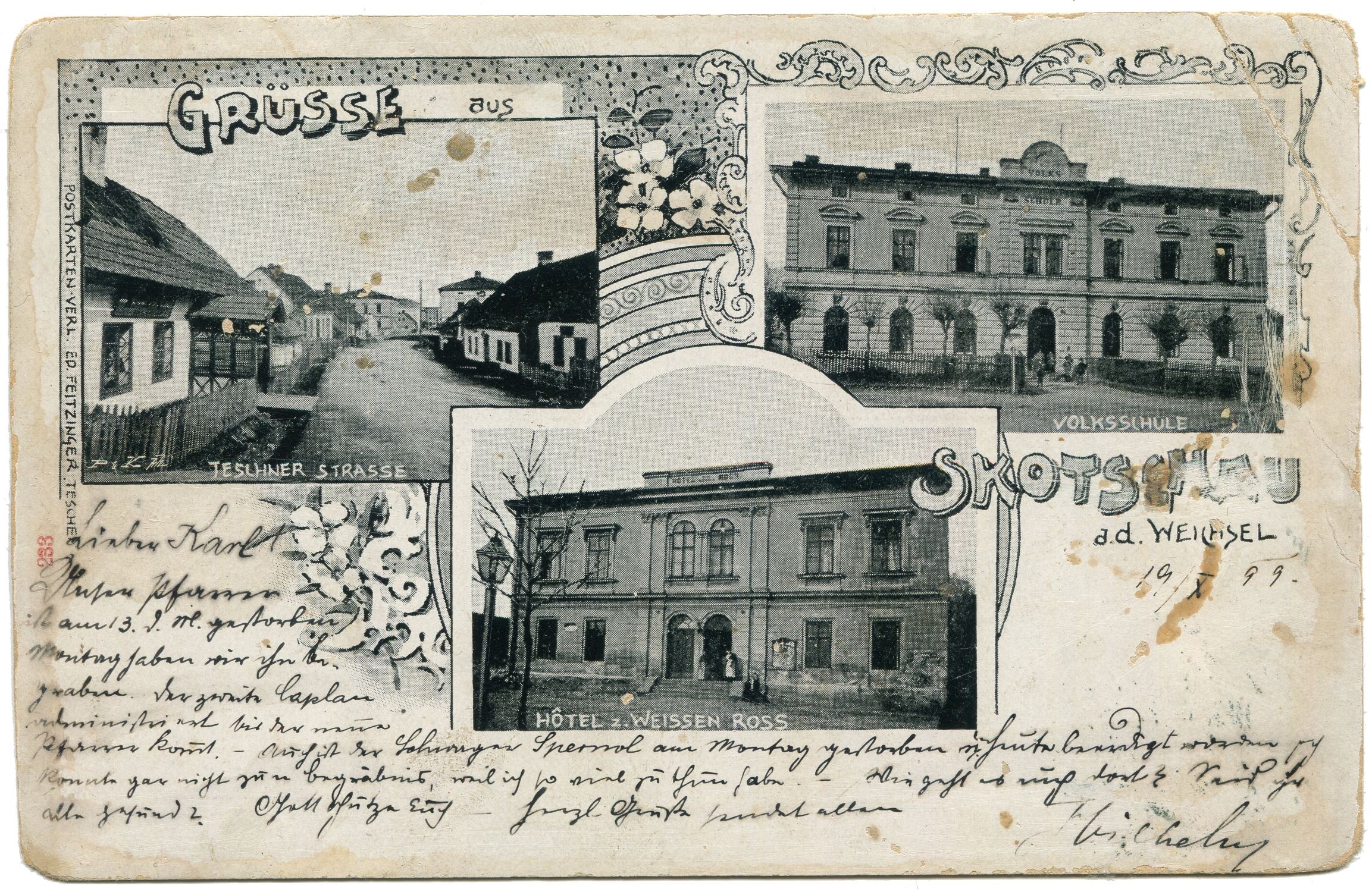 Ul. Cieszyńska, widok od strony kościoła ewangelickiego; Szkoła Ludowa przy ul. Bielskiej (SP nr 2); Hotel Pod Białym Koniem.