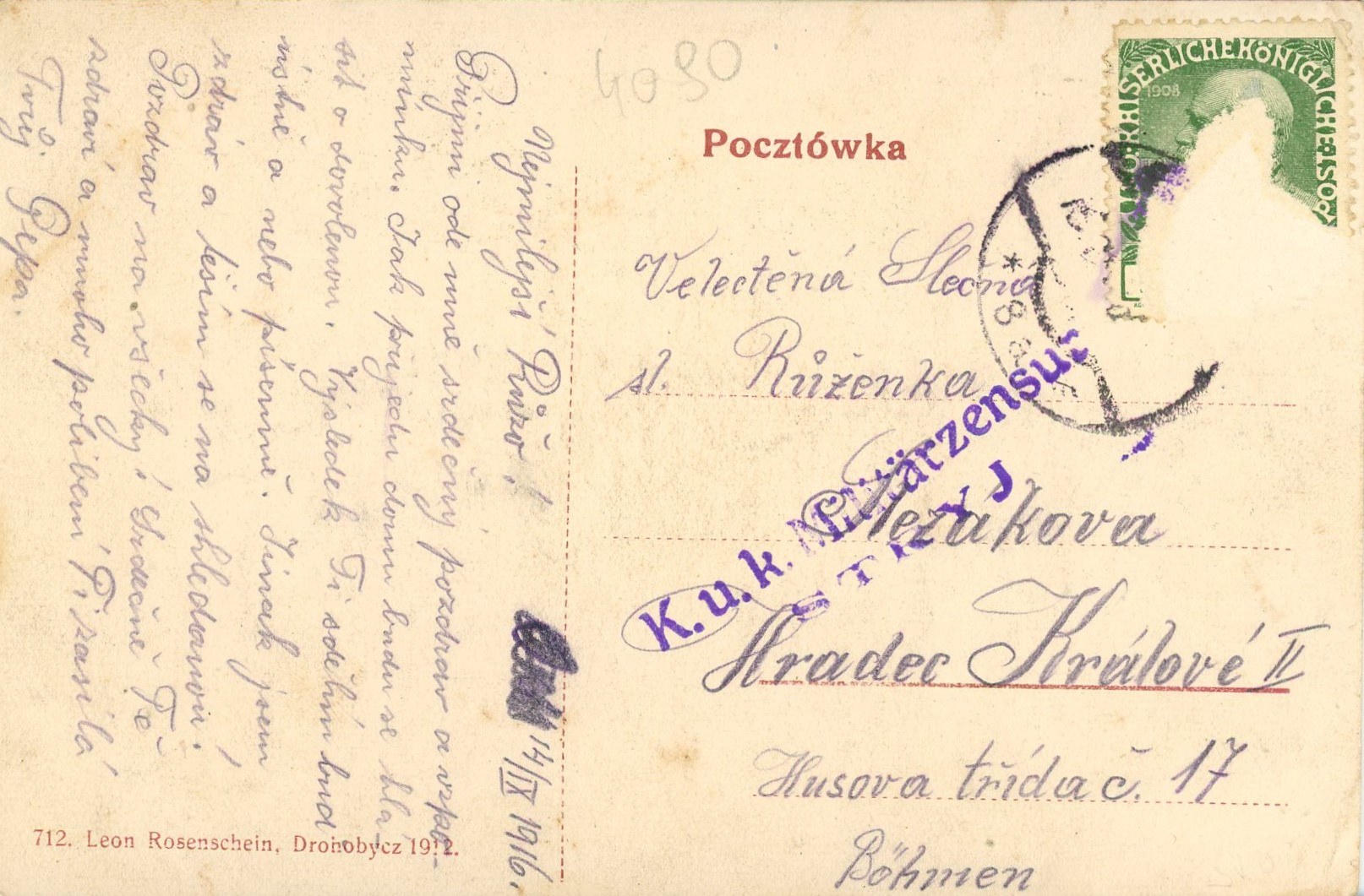 Nakł. Leon Rosenschein, Drohobycz, 1912. Kartka zapisana, dat. 14.9.1916 r. Częściowo oderwany znaczek, poza tym stan dobry. Rzadka.