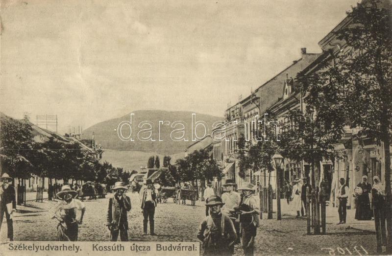 Székelyudvarhely, Odorheiu Secuiesc; Kossuth utca, üzletek, Budvár, Sterba Ödön kiadása / street, shops, mountain (EK...