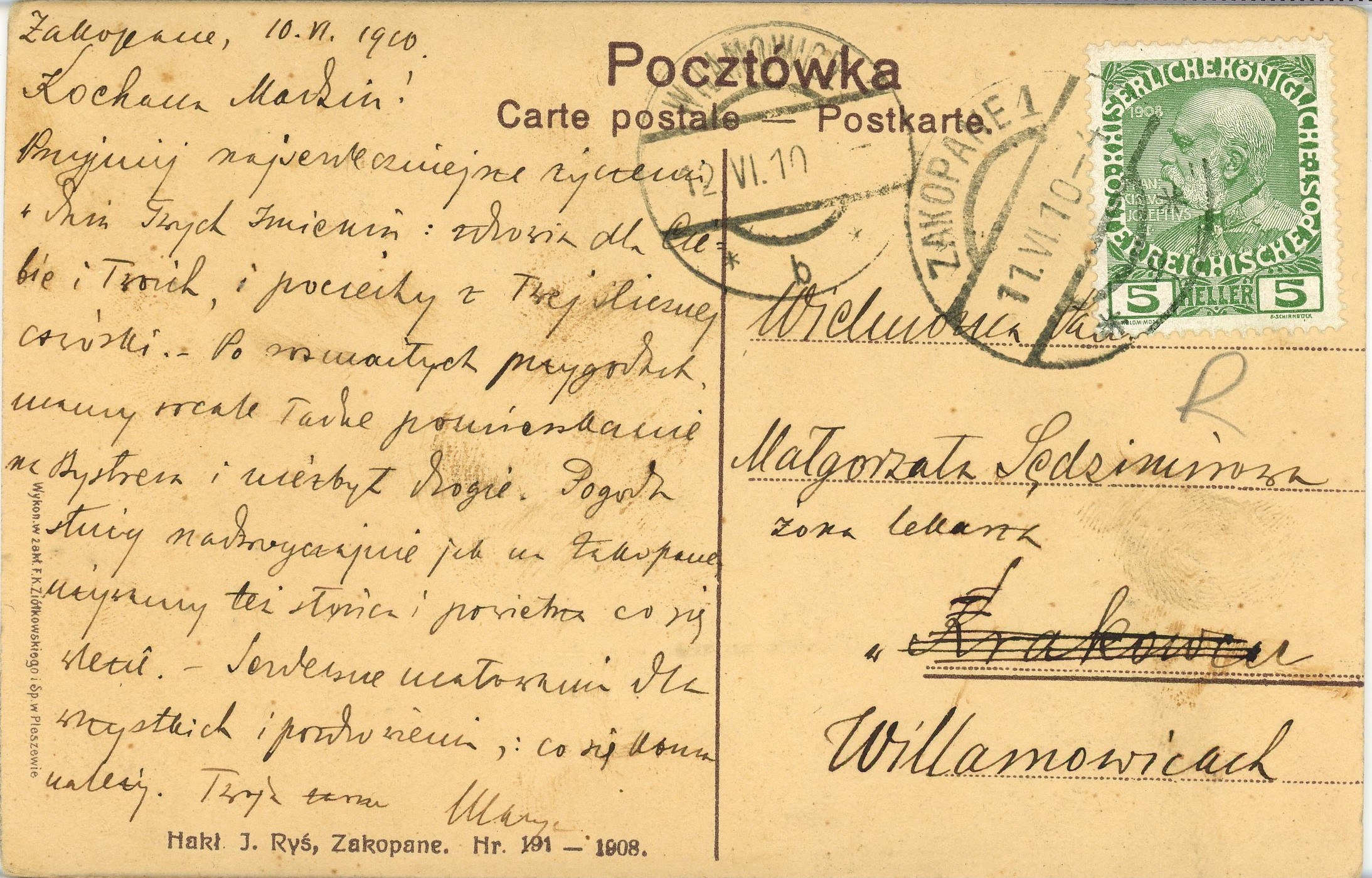 Nakł. J. Ryś, Zakopane, 1908. Kartka zapisana, dat. 11.6.1910 r. Stan bardzo dobry.