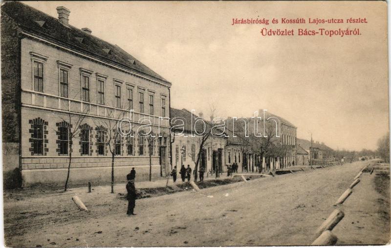 Topolya, Bácstopolya, Bács-Topolya, Backa Topola; Járásbíróság és Kossuth Lajos utca részlet. Wilheim Miksa kiadása (EK)