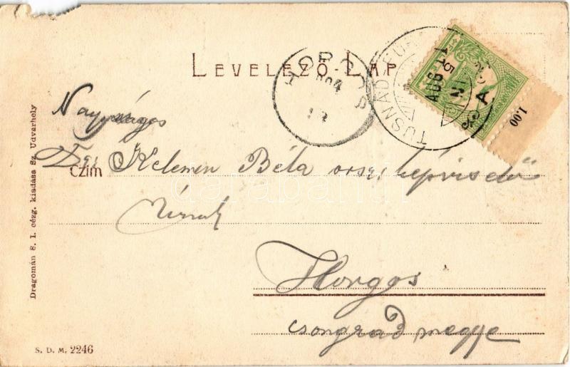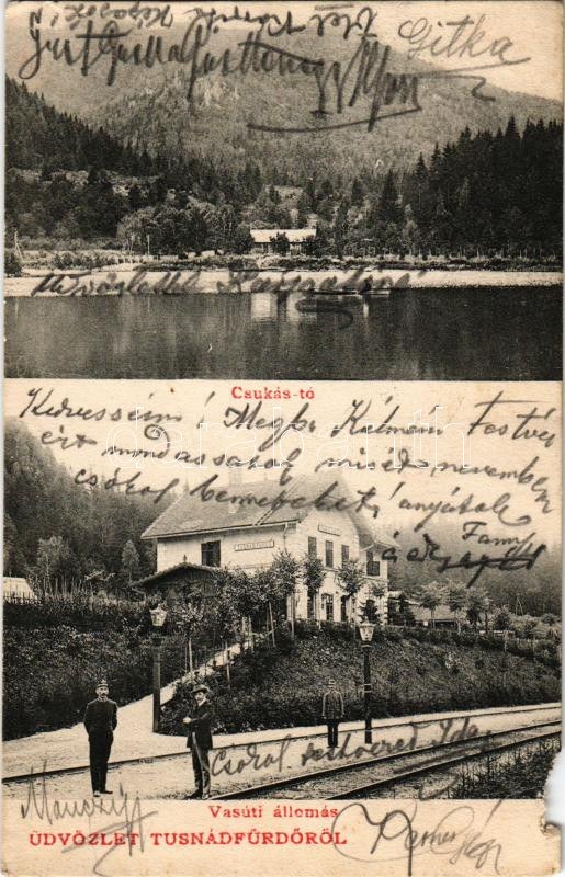 Tusnádfürdő, Baile Tusnad; Csukás tó, vasútállomás. Dragomán S. I. cég kiadása / railway station, Lacul Ciucas (lake) ...